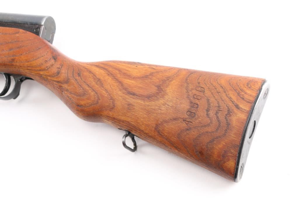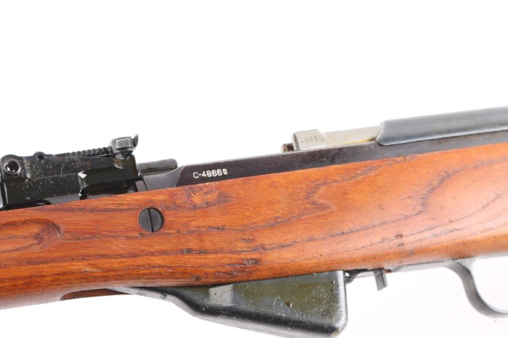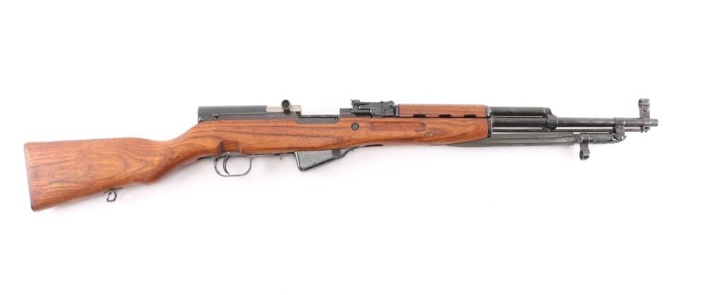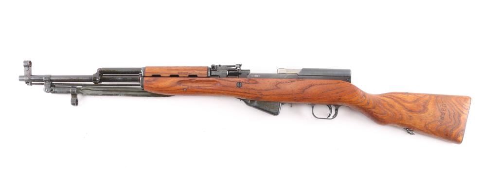 Zastava M59 PAP, also known as Papovka, is a Yugoslav licensed version of Soviet SKS semi-automatic rifle.'Mdl 59' Yugoslavian made gas-operated semi automatic rifle chambered in 7.62x39mm. Imported by CAI, right barrel. Features a blued finish, 20.5" barrel, hooded post front sight, tangent rear sight graduated to1,000 meters, cleaning rod, folding blade bayonet, manual safety, smooth trigger, fixed 10 round magazine, smooth wood handguard, pistol grip shoulder stock and trapdoor metal buttplate. Matching serial numbers on the receiver, bolt carrier, and stock. Rifle is coated with cosmoline from storage. Rifle retains approximately 95% of it's blued finish, with some minor edge wear, scratches/rubs, bore is ok with some frosting in the grooves, patches of dried cosmoline, good rifling. and wood stocks are good+ with several minor dings & gouges. Serial numbers puts it at pre 1967,