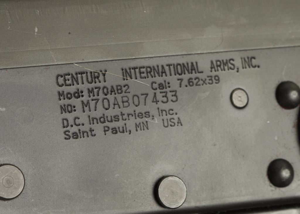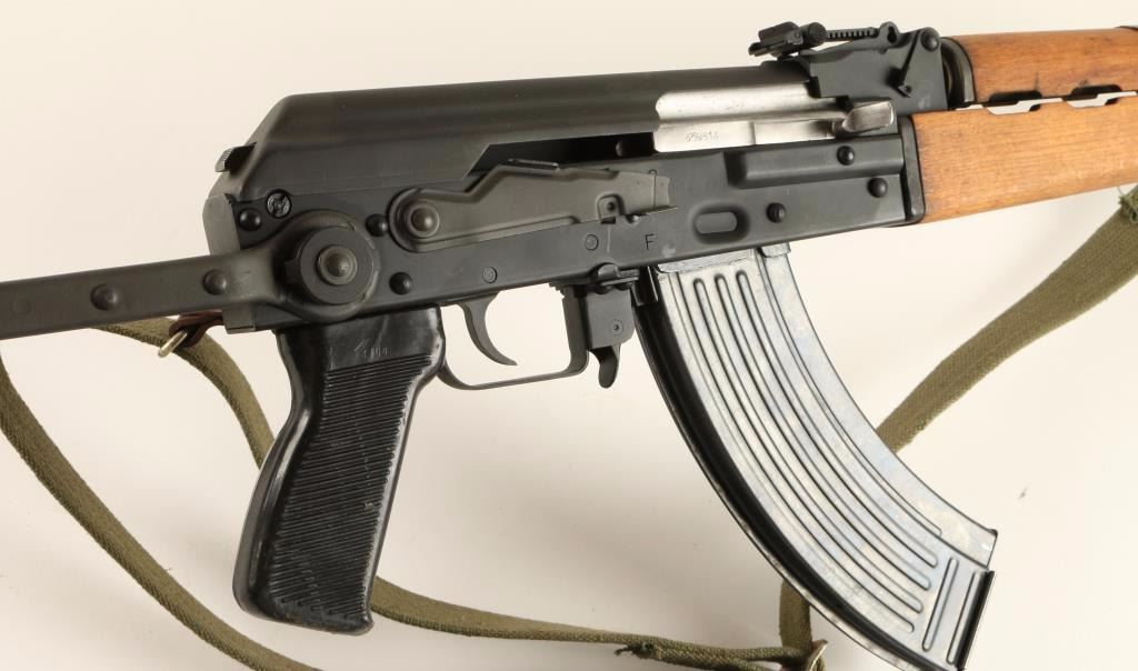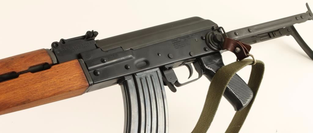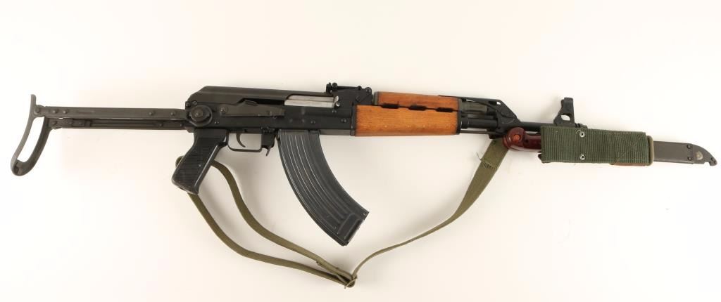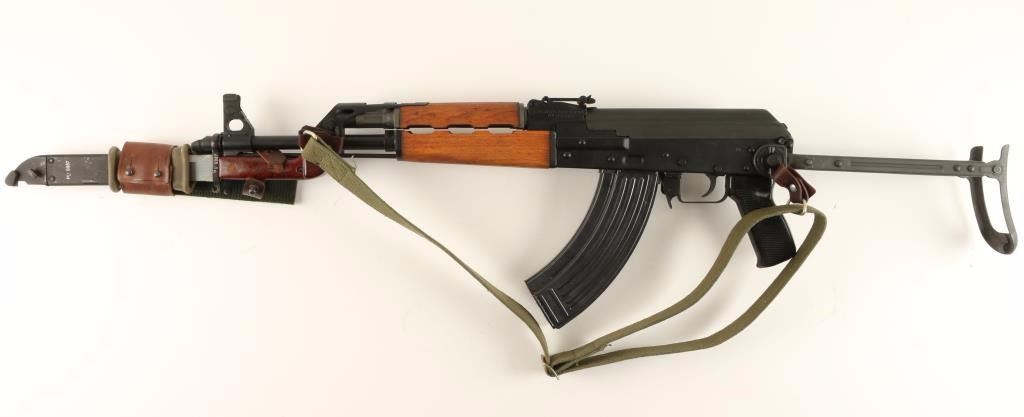 Yugoslavian copy of the AK-47 rifle chambered in 7.62x39mm. Features a blued finish, 16.5" barrel with slant muzzle break, bayonet with sheath, shrouded front sight, flip-up grenade sight, adjustable rear graduated sight, cleaning rod, green canvas sling, safety selector switch, smooth trigger, 30 round magazine, hardwood forend & handguard, and metal under folding shoulder stock. Rifle retains 97% blued finish with little wear. Action is smooth, bore is very good, are wood stocks are fine. Condition is excellent. ***Modern Firearm***