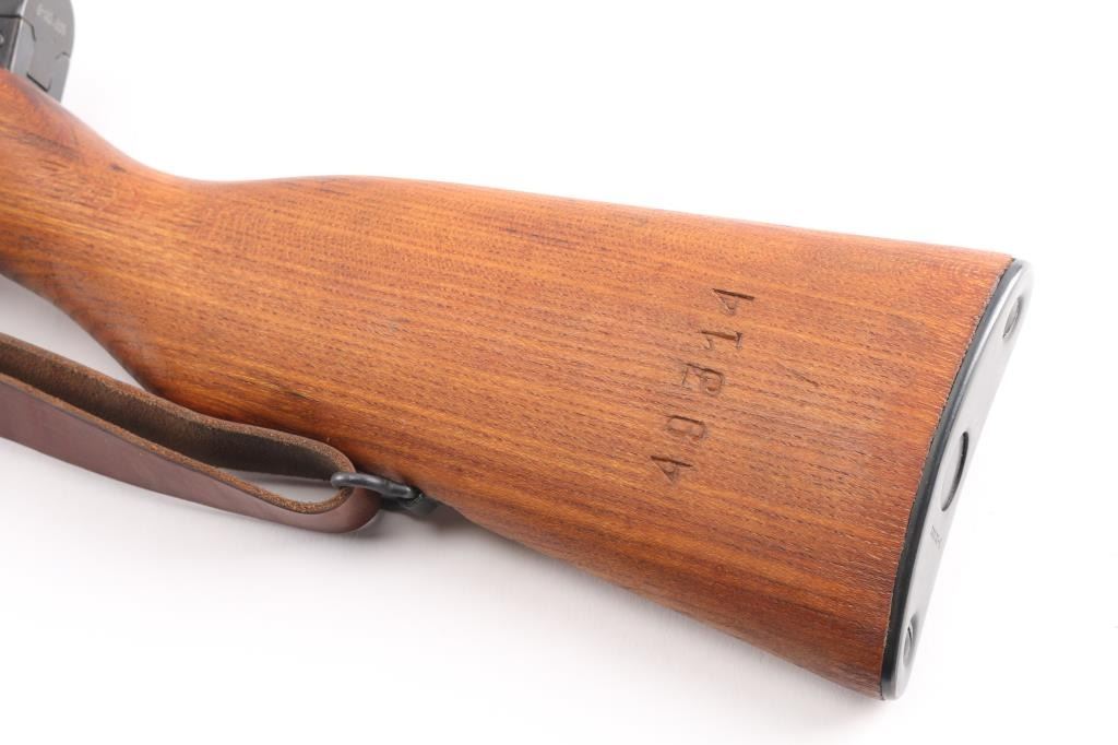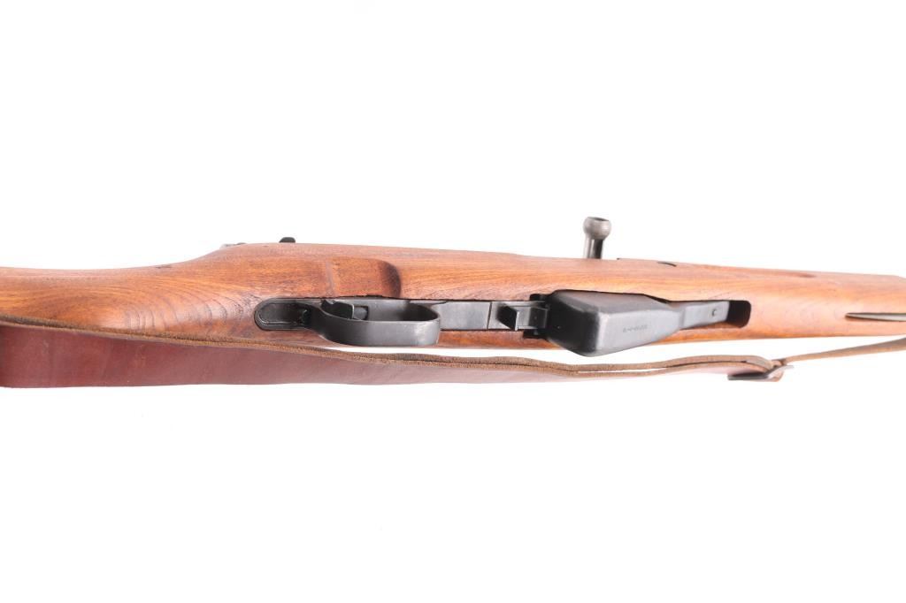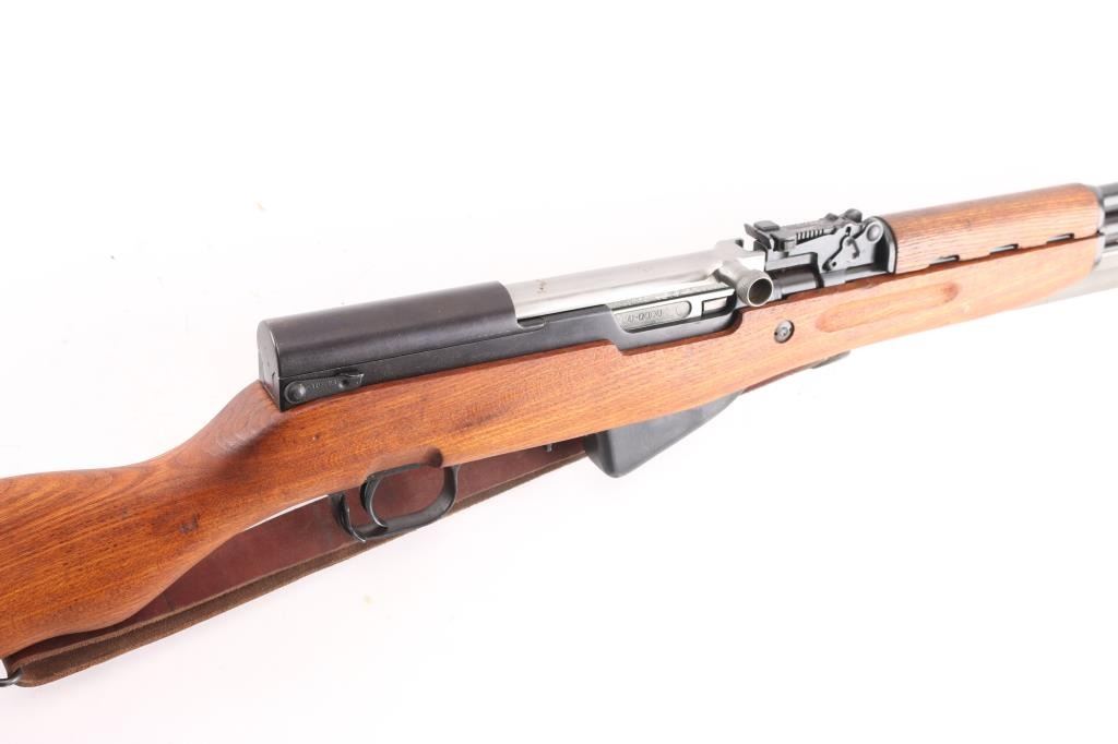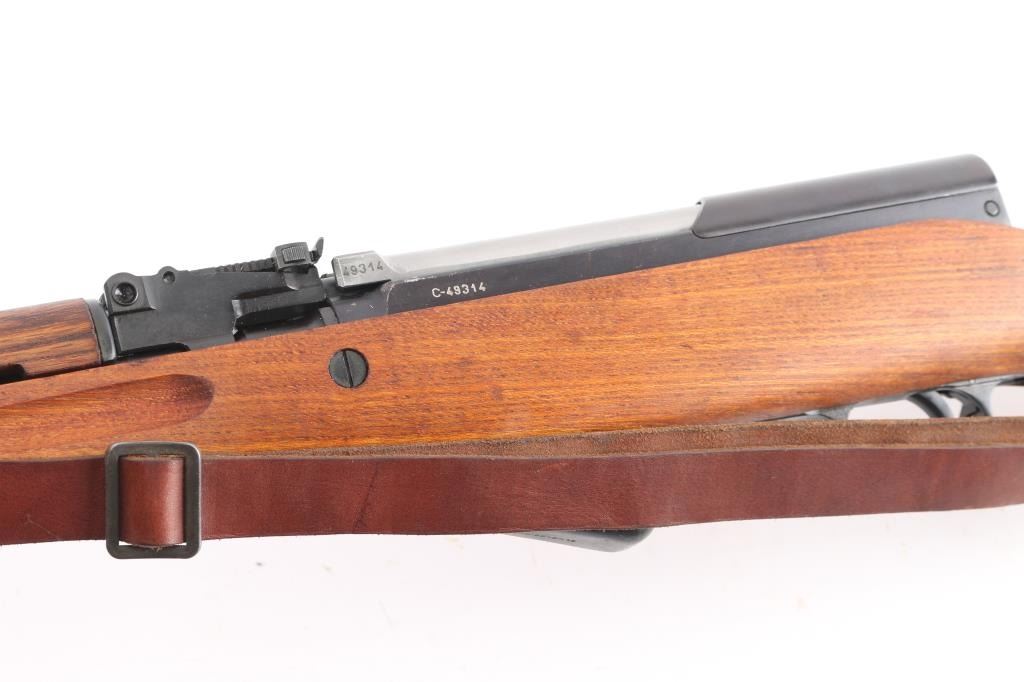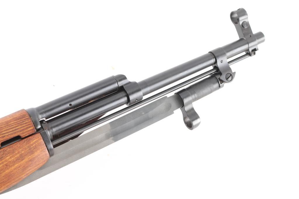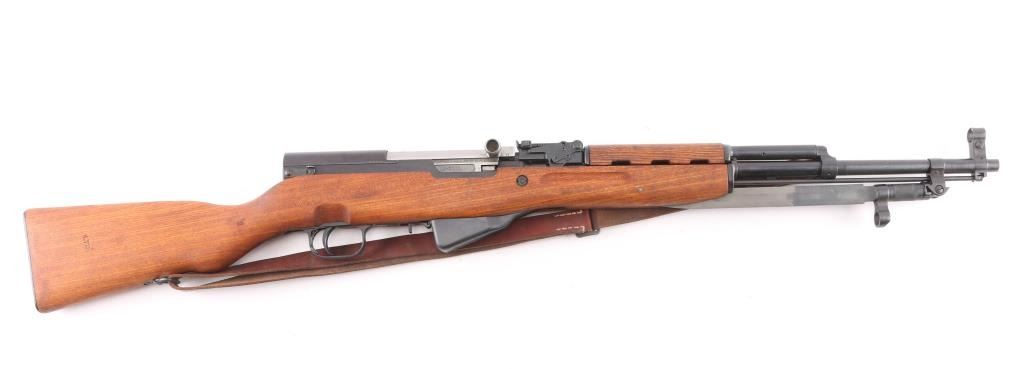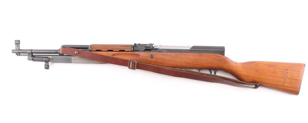 Zastava M59 PAP, also known as Papovka, is a Yugoslav licensed version of Soviet SKS semi-automatic rifle.'Mdl 59' Yugoslavian made gas-operated semi automatic rifle chambered in 7.62x39mm. No import marks observed. Features a blued finish, 20.5" barrel, hooded post front sight, tangent rear sight graduated to1,000 meters, cleaning rod, folding blade bayonet, manual safety, smooth trigger, fixed 10 round magazine, smooth wood handguard, pistol grip shoulder stock and trapdoor metal buttplate. Matching serial numbers on the receiver, bolt carrier, and stock. Rifle retains approximately 98% of it's blued finish, with some minor edge wear, bore is pristine and wood stocks are near excellent.. Serial numbers puts it at pre 1967. Leather sling attached.