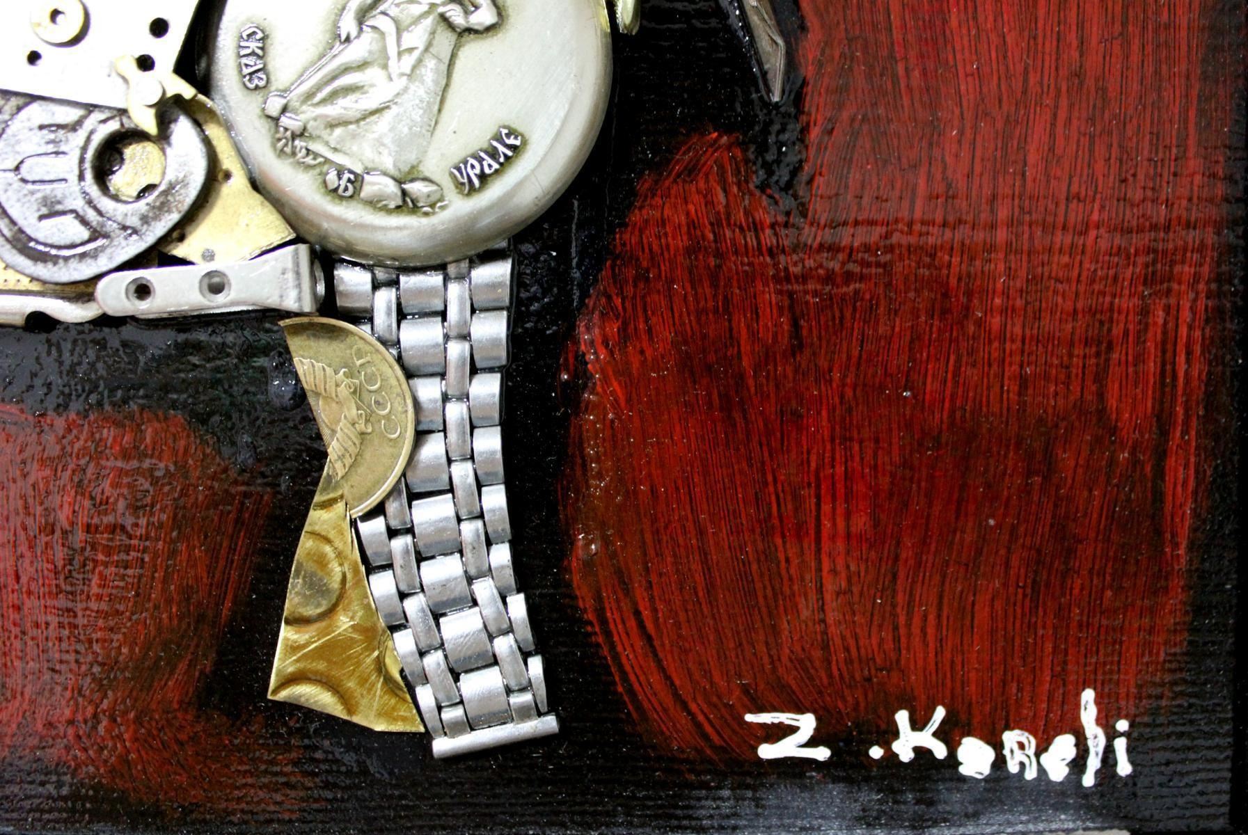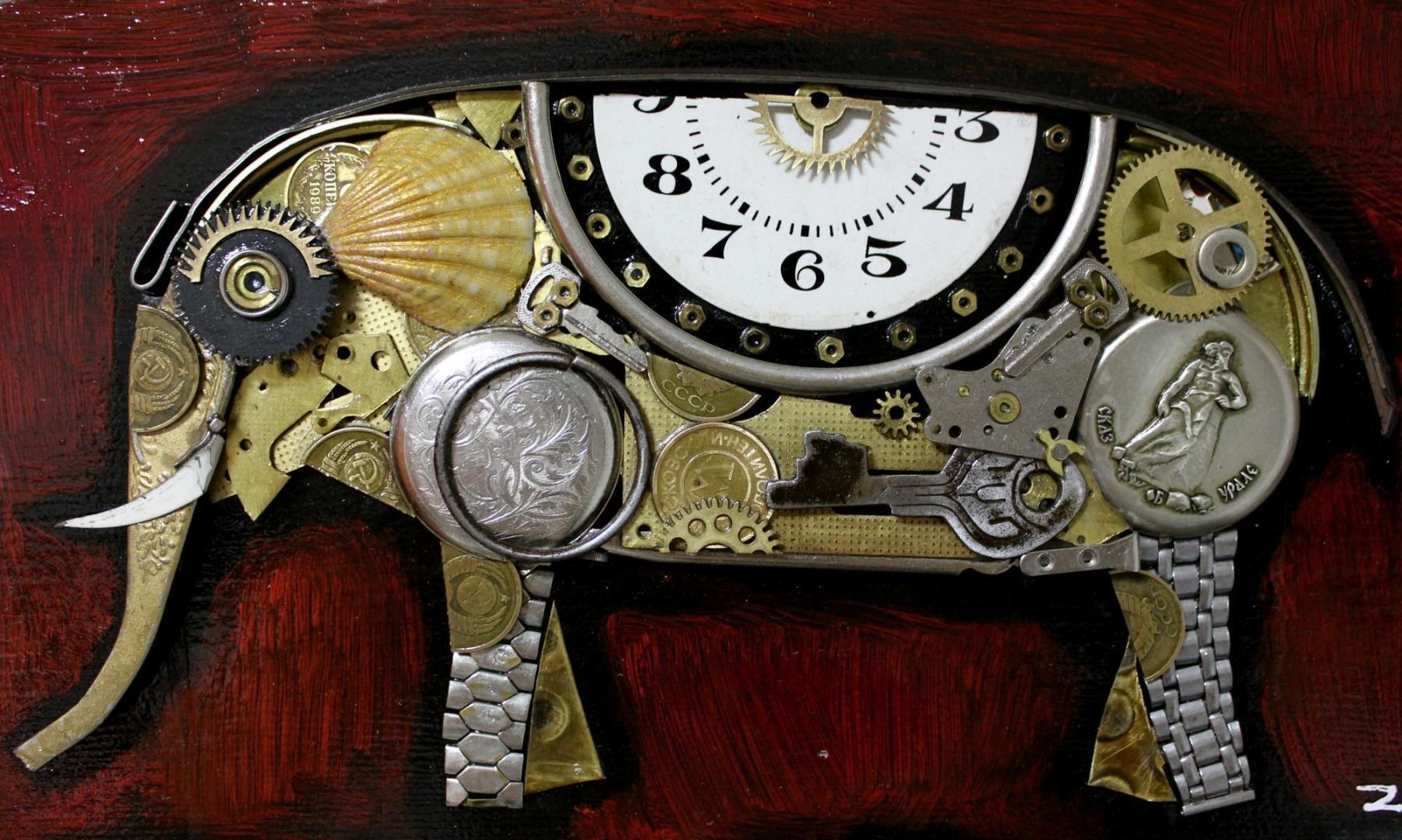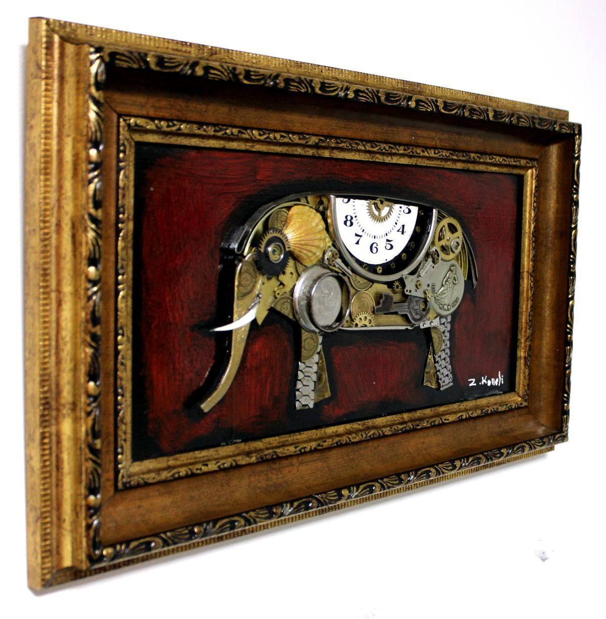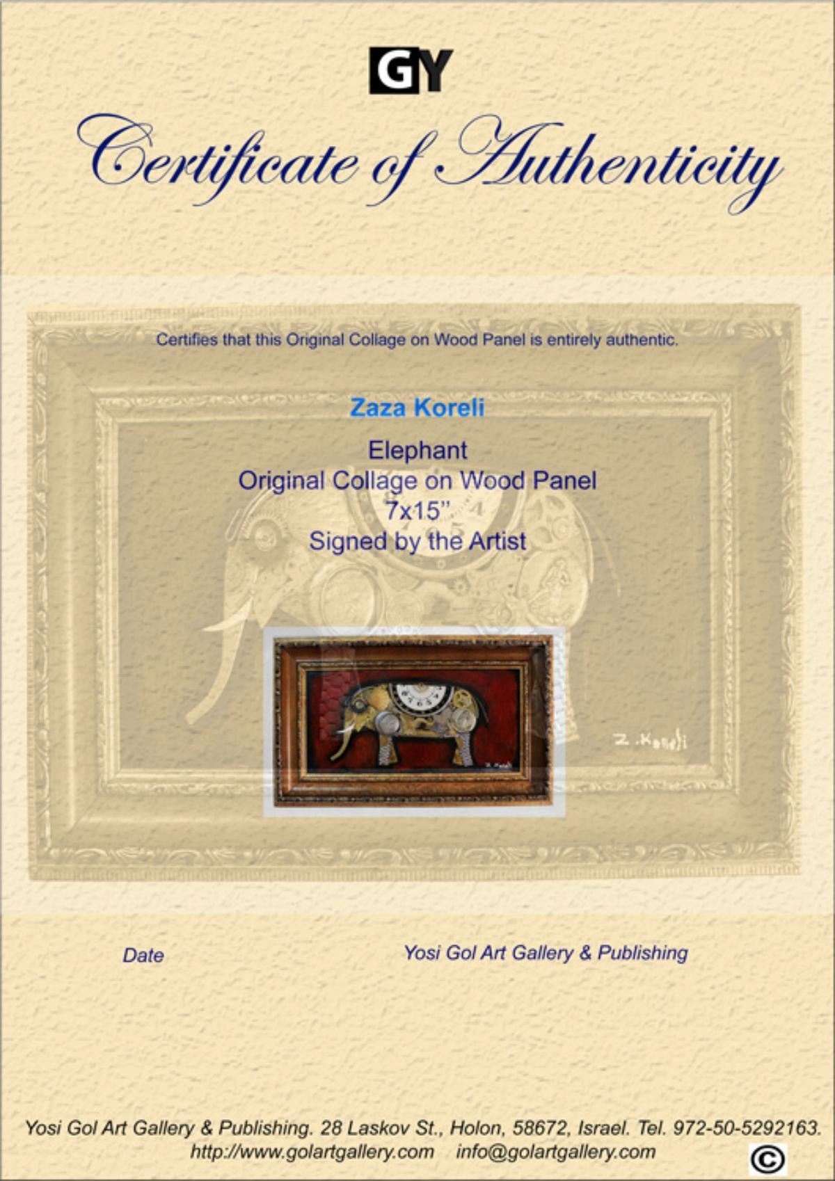 Artist: Zaza Koreli. Medium: Original Collage on Wood Panel. Title: Elephant. Size (Unframed): 7" x 15". Size (Framed): 12" x 20". Certificate of Authenticity: From the publisher. Reference# 10099.