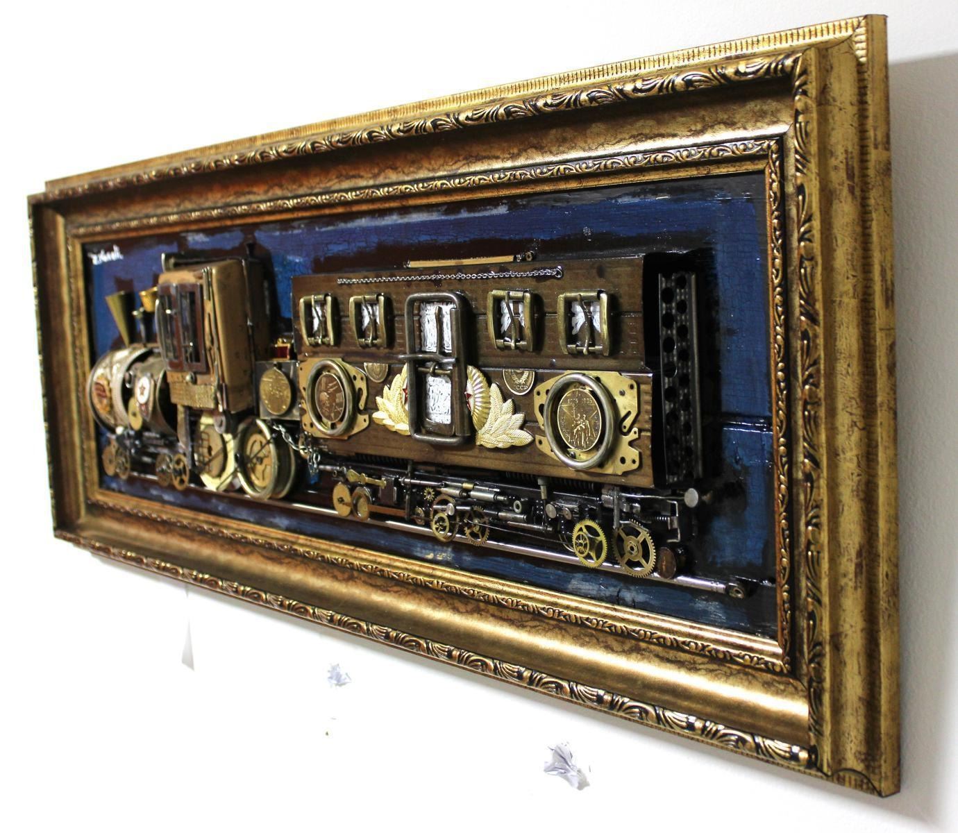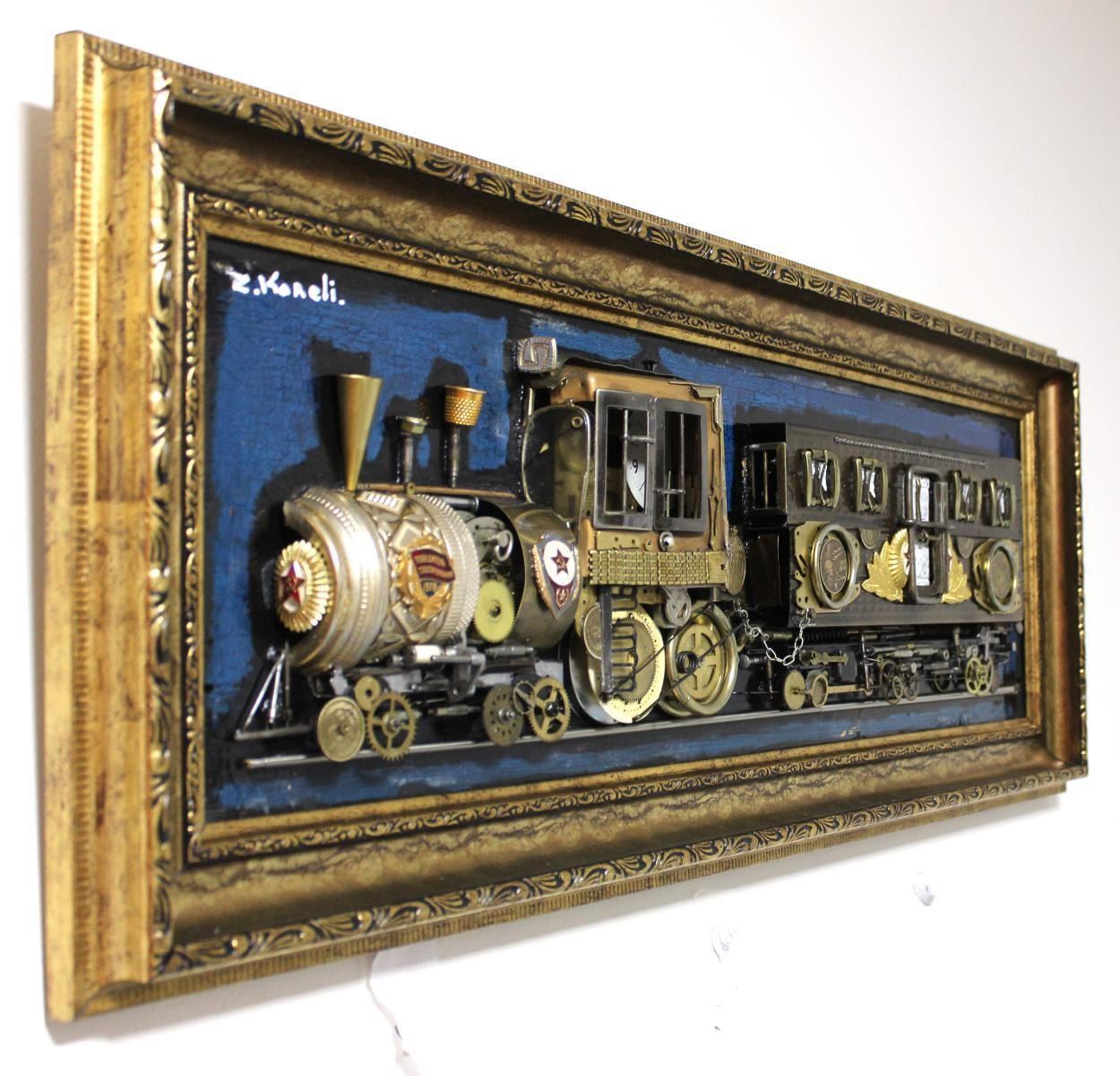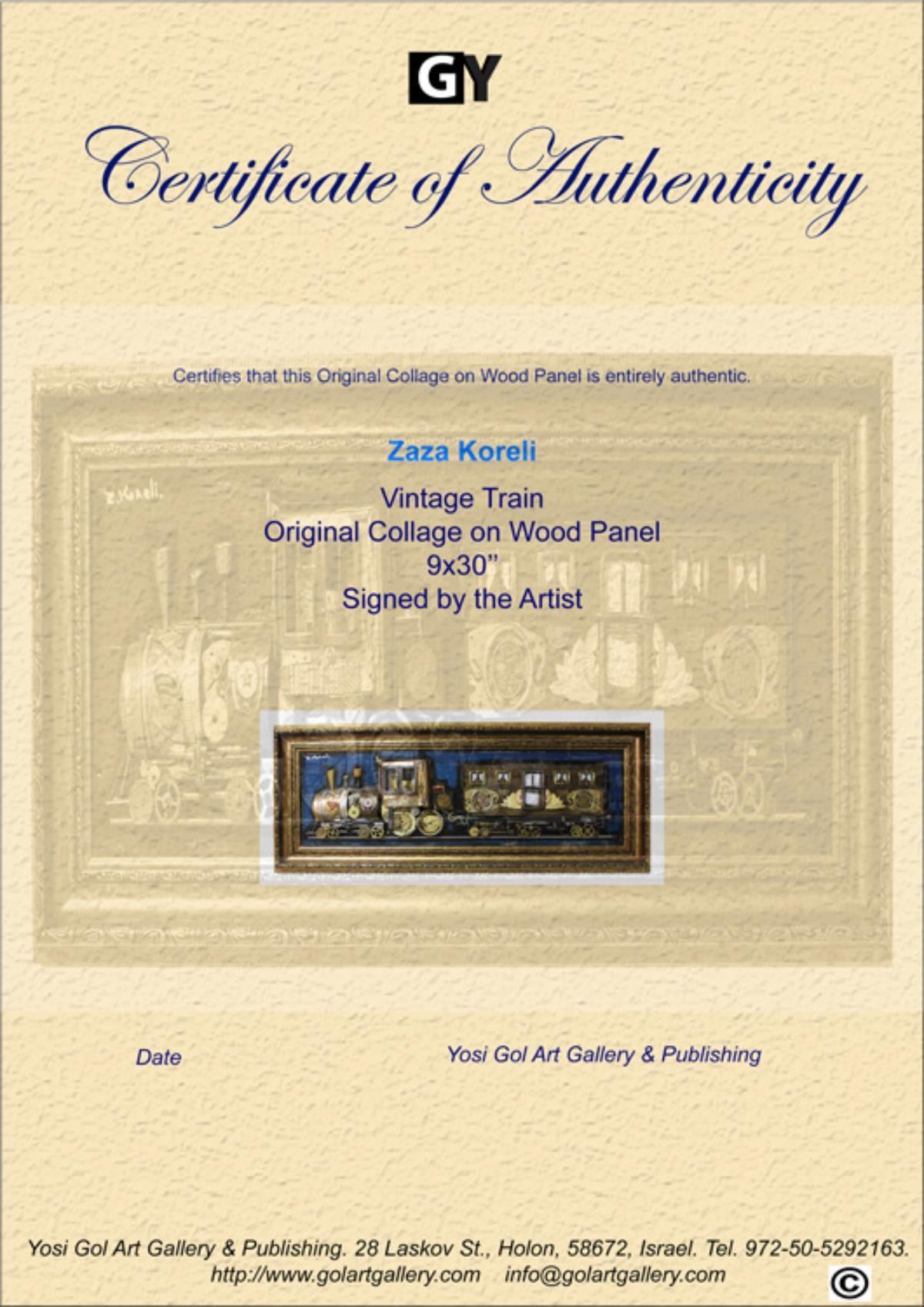 Artist: Zaza Koreli. Medium: Original Collage on Wood Panel. Title: Vintage Train. Size (Unframed): 9" x 30". Size (Framed): 12" x 34". Certificate of Authenticity: From the publisher. Reference# 10103.