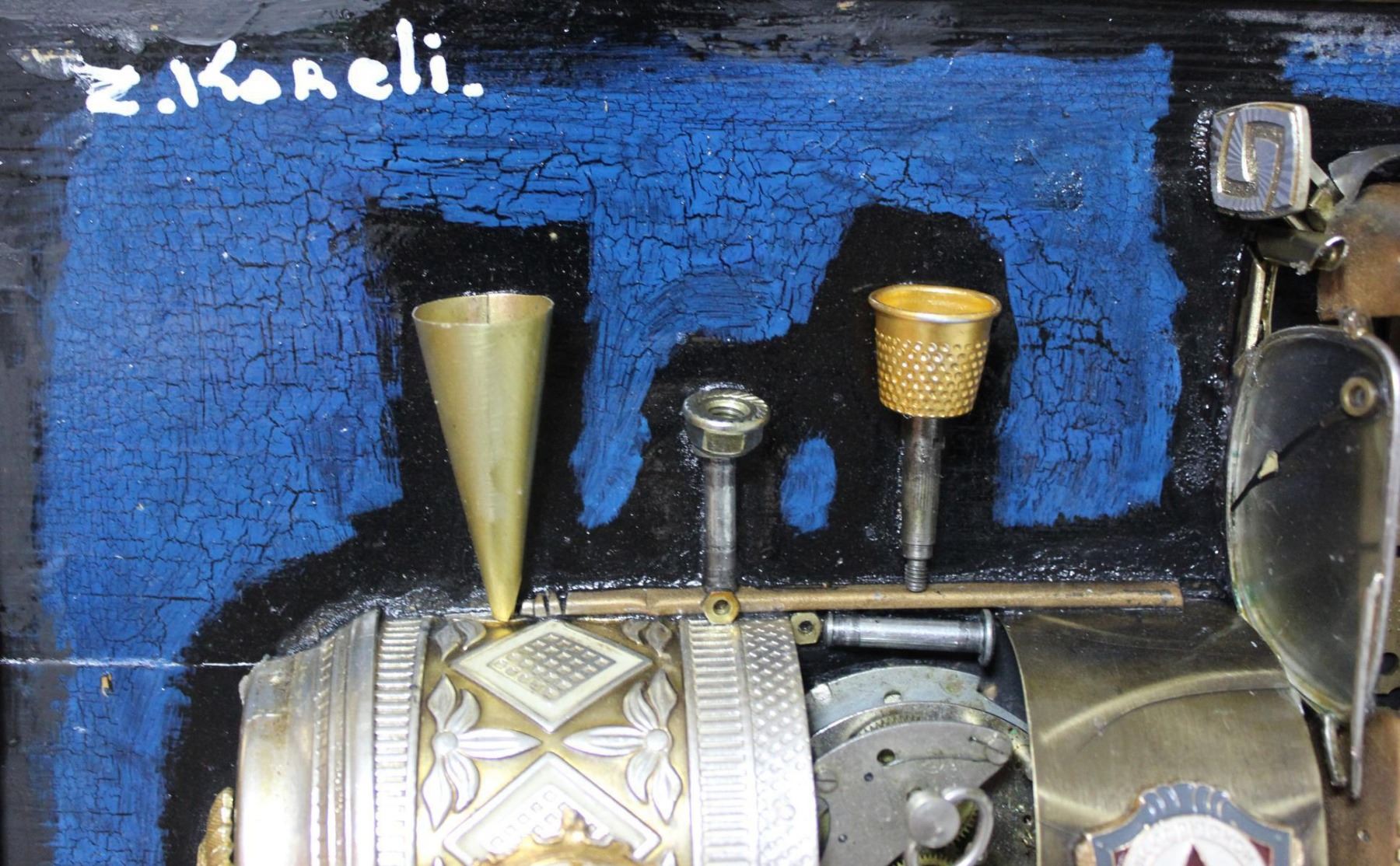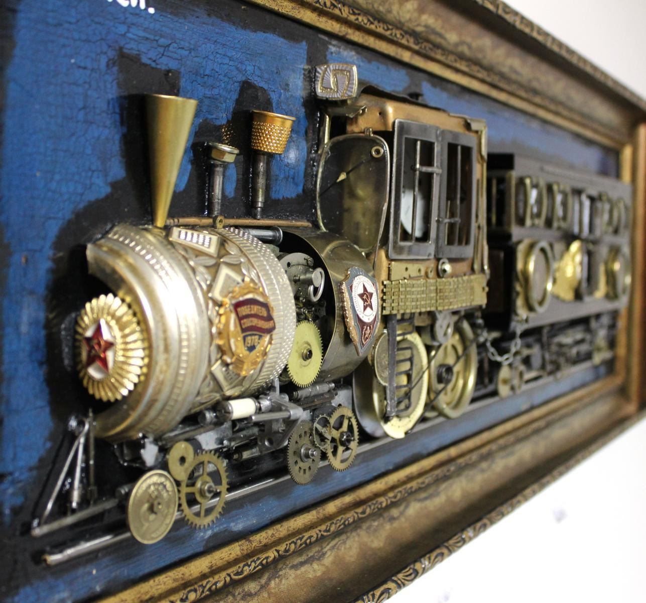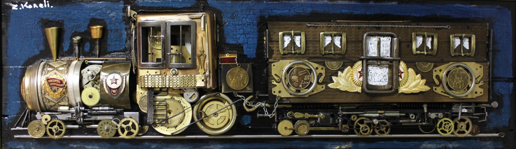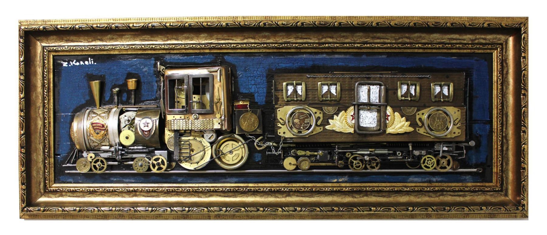 Artist: Zaza Koreli. Medium: Original Collage on Wood Panel. Title: Vintage Train. Size (Unframed): 9" x 30". Size (Framed): 12" x 34". Certificate of Authenticity: From the publisher. Reference# 10103.