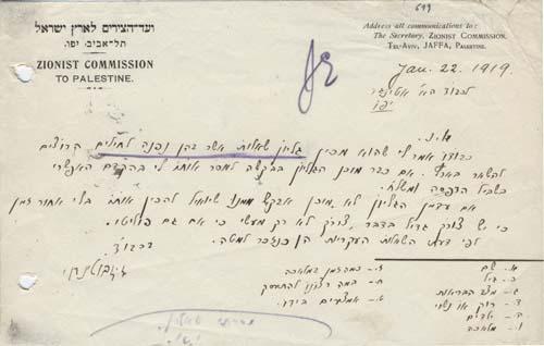 Autograph letter signed ''Z. Jabotinsky'' in Hebrew, datelined Jaffa, 22 January 1919 to Mr. Ettinger, regarding the Jewish Battalion. Two years earlier, Jabotinsky had convinced the British of the need for a Jewish Legion along the Palestinian front. This 38th Battalion of the Royal Fusiliers would fight for the liberation of Eretz in 1918. Despite Jabotinsky’s efforts, the Jewish Legion was reduced by the anti-Zionist British Military Administration. Single 8.25'' x 5.25'' page. In very good condition with two punch holes and creasing.