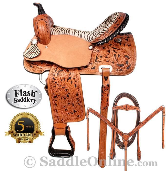 Brand: Flash SaddleryTM Color: natural and tan Seat: padded zebra print (hair on hide) Zebra print conchos Rough out jockey Hand carved skirts Well balanced tree. Measurements: Gullet: 6.5" QH Bars, 7.25" High (suitable for high withered horses.) Also available in 7" FQHB model 2956F Cantle: 5" Skirt: 26" Horn: 3.5" Swell: 12.5" Stirrups: Shortest: 31" Longest: 36"
