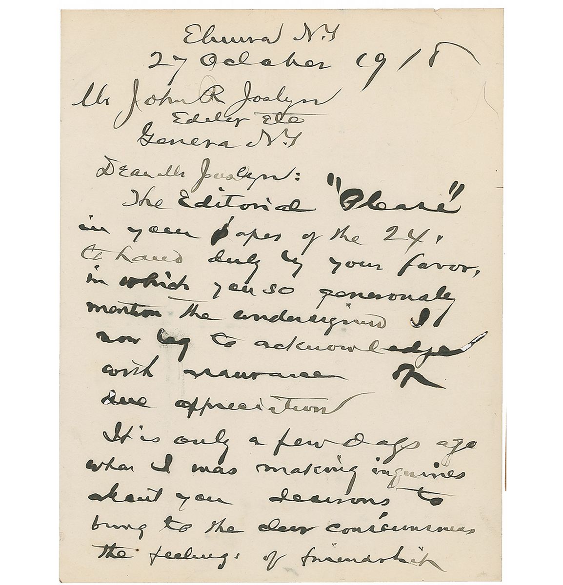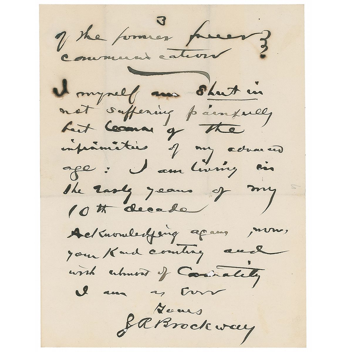 Penologist (1827–1920) regarded as the ‘Father of Prison Reform’ who introduced the concept of parole to the American justice system. ALS signed “Z. R. Brockway,” three pages, 8.5 x 11, October 27, 1918. Letter to a gentleman. In part: “The editorial 'Please' in your paper of the 24th at hand duly by your favor, in which you so generously mention the undersigned I now beg to acknowledge with assurance of due appreciation. It is only a few days ago when I was making inquiries about your decisions to bring to the clear consciousness the feeling of friendship particularly the product of our familiar friendly intercourse when you were living here: is not this fact and the fact of your kind courtesy now again confirmative of the theory of existence of the science of Telepathy? I am glad thus to get into renewal of the former closer connection with you. I would like to Know, if you can and would tell me, more about you and yours these days after so long a suspension of the former communication. I myself am shut in not suffering painfully but because of the infirmities of my old age: I am living in the early years of my 10th decade.” Intersecting folds (one vertical fold passing through a single letter of the signature) and ink erosion to letters in a few words (including a small area to first letter of signature), otherwise fine condition.