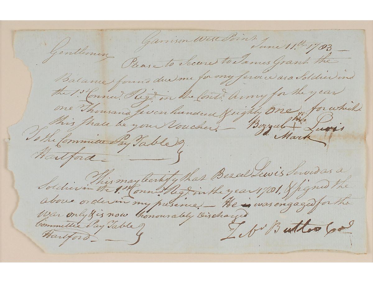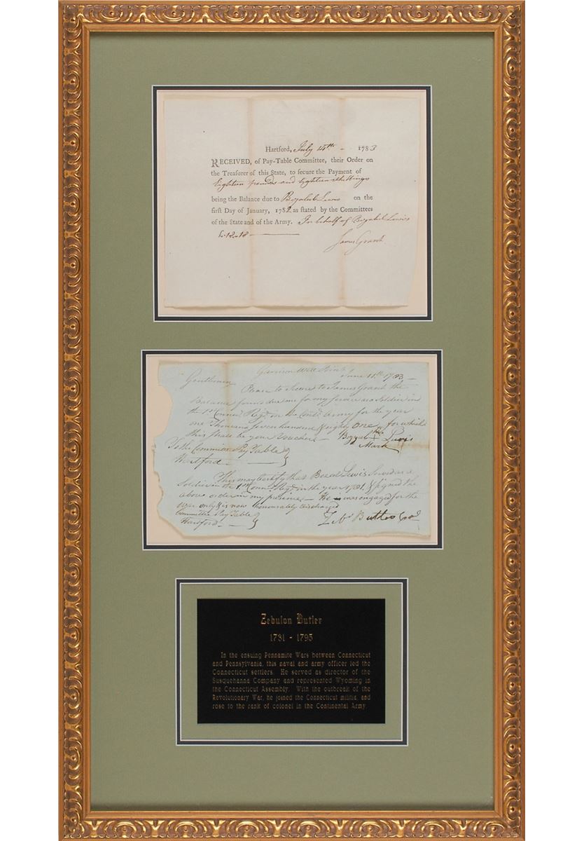 Soldier and politician (1731–1785) who served in the Connecticut Assembly and commanded the garrison of Forty Fort in the Wyoming Valley during the Revolutionary War. Revolutionary War–dated manuscript DS, signed “Zeb’n Butler Col.,” one page, 8.75 x 5.5, June 11, 1783. Butler certifies a pay request for a soldier in the Continental Army, in part: “This may certify that Buzel Lewis served as a Soldier in the 1st Connect. Regt. in the year 1781 & signed the above order in my presence—He was engaged for the war only & is now honourably discharged.” Signed at the conclusion by Butler. Includes the subsequent partly-printed payment receipt, July 14, 1783, signed by James Grant on the behalf of Lewis. Mounted, double-matted, and framed to an overall size of 15 x 27. Intersecting folds, scattered soiling, and paper loss to left edge, otherwise fine condition.