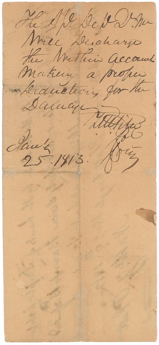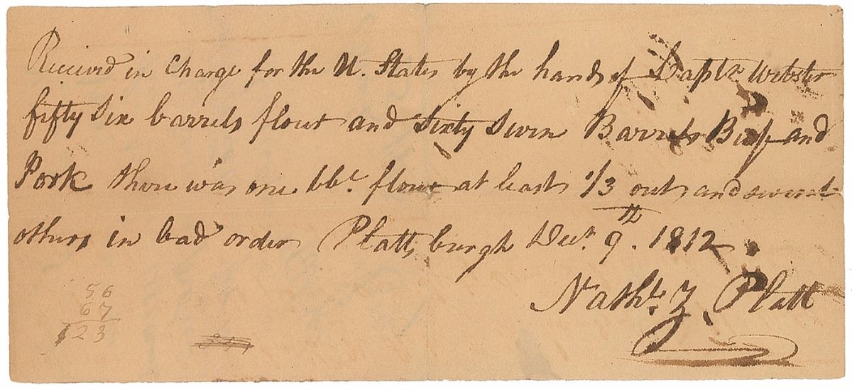 American military captain and explorer (1779–1813) who, at the behest of President Thomas Jefferson, led an expedition through the Louisiana Territory and recorded the discovery of what is now known as Pikes Peak. ADS, signed “Zeb. Pike,” one page both sides, 3.5 x 8, January 25, 1813. Pike approves a payment, in full: “The Ajt. Dept. Qr. Mr. Will Discharge the within account making a proper Deduction for the Damage.” The reverse provides an invoice in another hand for beef, pork, and barrels of flour of which some were “in bad order.” In fine condition, with folds reinforced at edges.