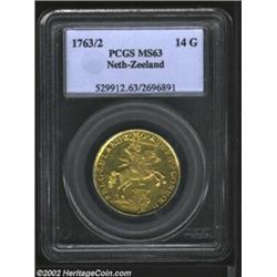 Zeeland gold 14 gulden 1763/2, Knight on horseback/Arms with date and value, F-313, KM-97, MS63 PCGS