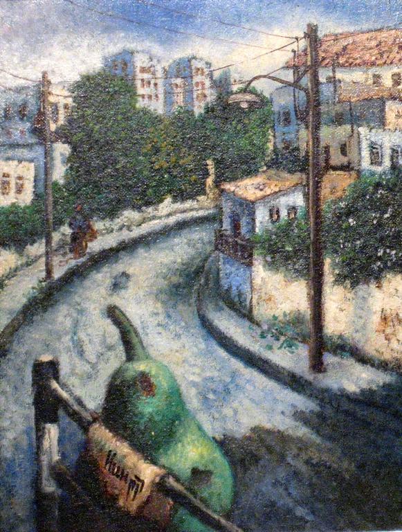 Zeev Kun, Israeli Art, B. 1930, Pear on Landscape, Oil on canvas mounted on cardboard, 30x22cm, Signed., , , , ,