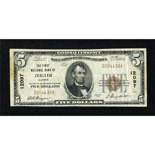 <B>Zeigler, IL</B></I> - $5 1929 Ty. 1 <B>The First NB</B></I> Ch. # 12097<BR> This is an example of a note that is always in demand by the collectors seeking to complete an A-Z alphabet set of town names. The note is a decent <B>Very Fine</B></I> with just a trace of staining in the left and right margins on the back.<BR><BR><b>Shipping:</b> Coins & Currency (<a target="_blank" href="http://www.heritageauctions.com/common/shipping.php">view shipping information</a>)