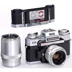 Zeiss Ikon, Stuttgart, Nr. G 36.981, chrom, schöner Zustand, Belichtungsmesser zeigt an, (3+/3). Mit "Planar 2/50", Chrom, Nr. 2.370.856, (3/2). "Sonnar 4/135", chrom, Nr. 3.264.178, (3-/2), und Contarex-Wechselmagazin, chrom, (2/2). The last Contarex camera, the "Electronic", excellent condition, light meter works. With Planar and Sonnar lenses and interchangeable magazine. - € 1.600/2.100 - (140/1)
