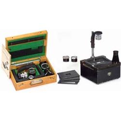 Reproduktionsgerät 5520/1" € 110,- 1) Zeiss Ikon, Dresden, komplett(!): Fuß, Säule, Tragarm, Objektivhalter-Ring mit Zwischenringen, 4 Bildbegrenzungsmasken, Mattscheibenadapter, Aufstecklupe, Drahtauslöser, Anleitung, im Holzkasten, (2/2). - Und: 2) "Leuchtkasten 5520/8" für Diareproduktion mit Maske 5520/1 für die Filmführung, (3/3). Complete universal stand for large copying apparatus, with lighting system for universal stand. - € 150/200 - (122/11)