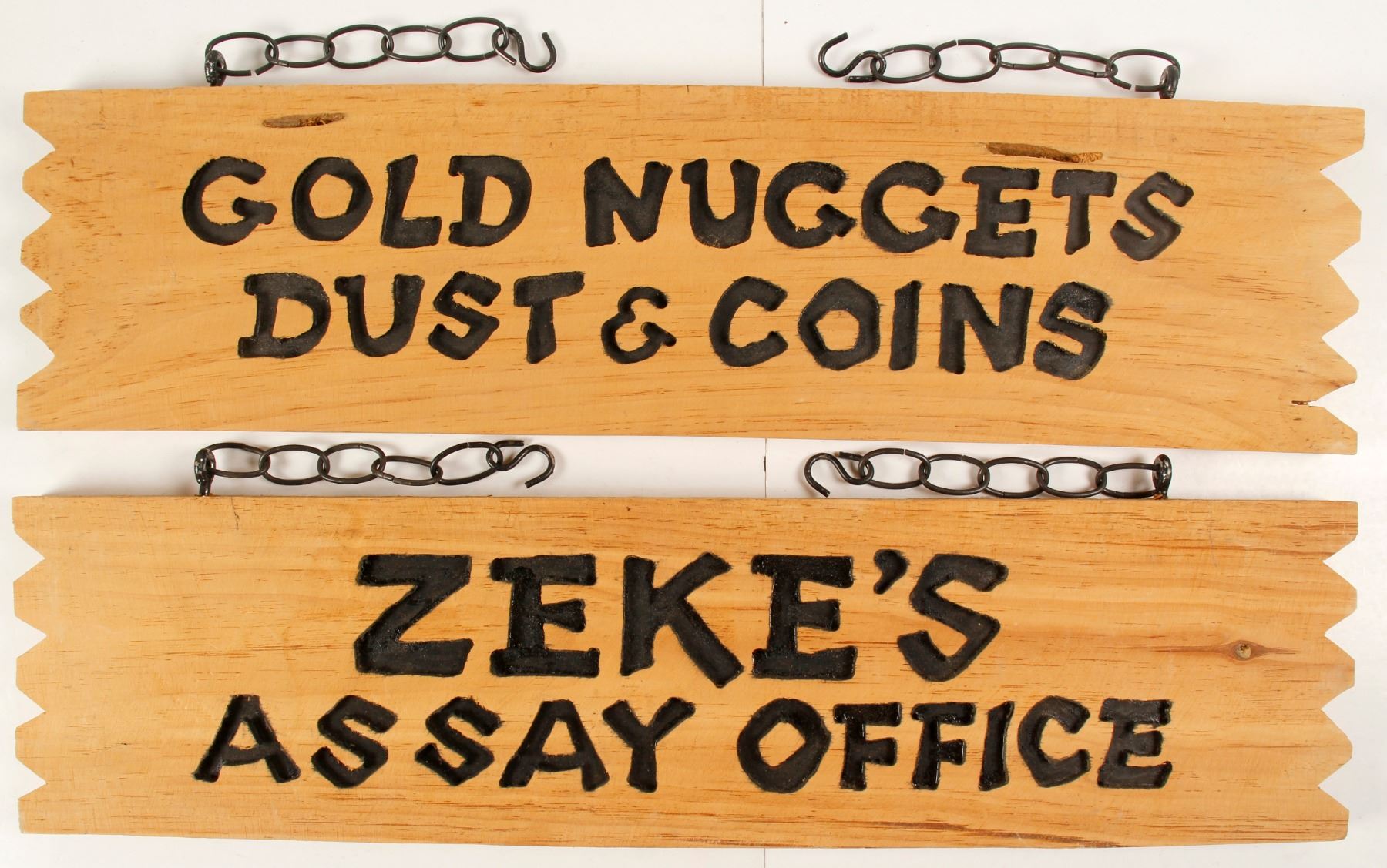 2 piece wood sign with carved and black highlighted Zeke's Assay Office/Gold Nuggets & Coins, 7 x 28" and hanging chain. Also includes Zeke himself an approx 59" miner doll complete with a long gray beard, hat, denim shirt and pants, a vest and black boots. Additional shipping will apply.