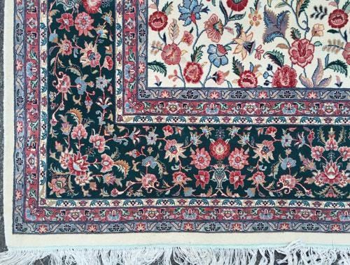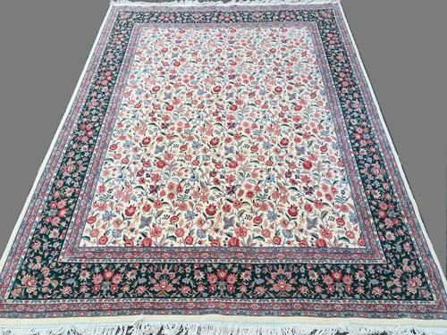 Magnificent, Fine Rare Zelle-Sultan Design Silk Blend Persian-Pak Kashan Rug. 100%Natural, vegetable dye, hand woven, pure silk, finest baby lamb's wool pile on cotton foundation. This is a strikingly lustrous all-over Zelle-Sultan floral design over a beige color background. The expression "all-over" is referred to rugs with a pattern spread out through out the rug, where the design repeat itself over and over again. The advantage is that furniture can be placed anywhere on the rug without interrupting the pattern. The crisp and well defined curve-linear design is a testament to the fine weave and the artistic workmanship. Where a typical rug is limited to a range of twelve and sixteen colors, this beautiful piece features more than thirty eight different colors, creating an exquisite tapestry of colors that is feast for the eyes. This lovely piece is masterfully hand woven, knot by knot, and has over 180 knots per square inch and it is very well packed. It takes over four years to weave this beauty and bring it to the market. This breathtaking royal Kashan has a rare Zelle-Sultan pattern that is hard to come across in the market place. The western style bouquet design became part of Persian rugs designs with its dominant all over floral pattern due to the baroque era commercial and cultural exchanges between Europe and Persia in the 17th century. This is a beautiful example of Zelle-Sultan royal Kashan. Size 14 feet 2 inches X 10 feet 1 inch. Country of origin: Pakistan.
