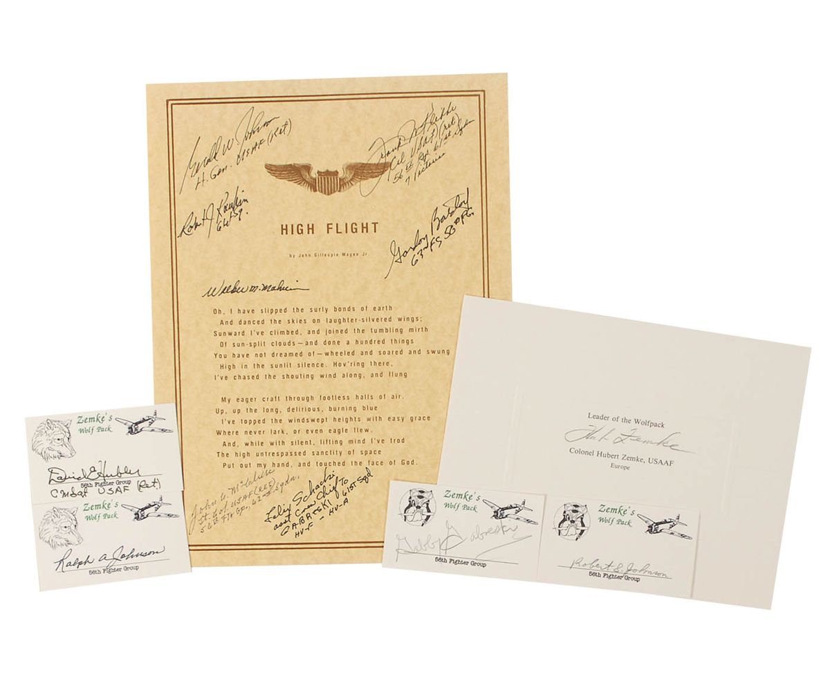 Six items: one souvenir typescript of the poem High Flight, one page on an 8 x 11 cardstock sheet, signed in black felt tip and ballpoint by Jerry Johnson, Walker Mahurin, Gordon Batdorf, Felix Schacki, Robert Rankin, Frank Klibbe, and John McClure; one off-white 8 x 6 card signed in pencil by Hubert Zemke; and individual custom 3.5 x 2 cards, signed by David Hubler, Ralph A. Johnson, Robert S. Johnson, and Gabby Gabreski. In overall fine condition.