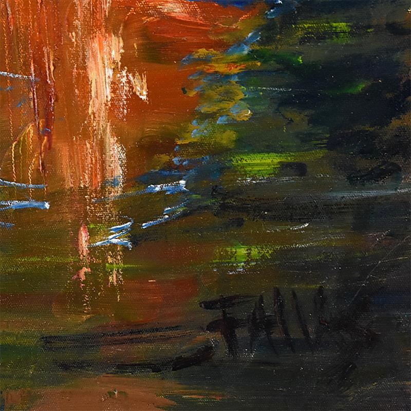 "Zen Bridge" is an original oil painting on board by Elliot Fallas, hand signed by the artist. Includes Letter of Authenticity. Measures approx. 16" x 20" (image). The sides of the canvas are painted and it can be hung as is, but a frame is definitely recommended.