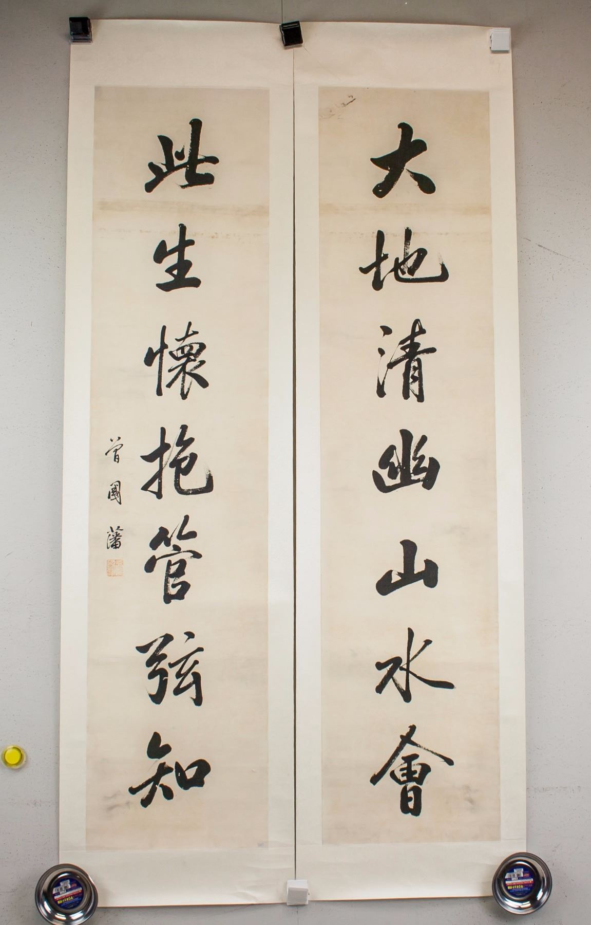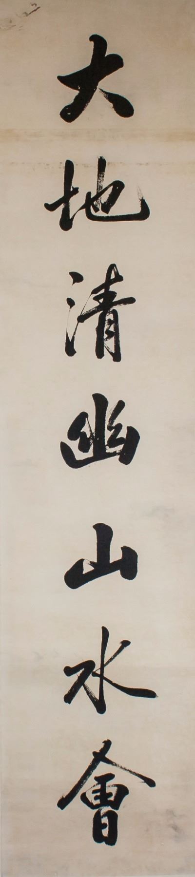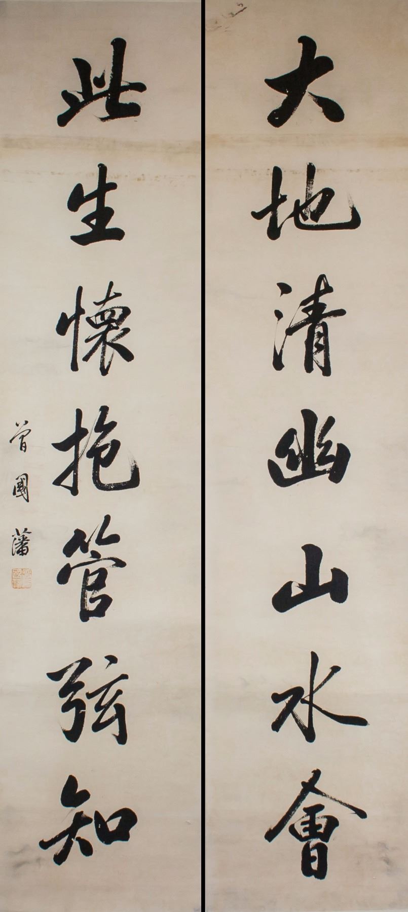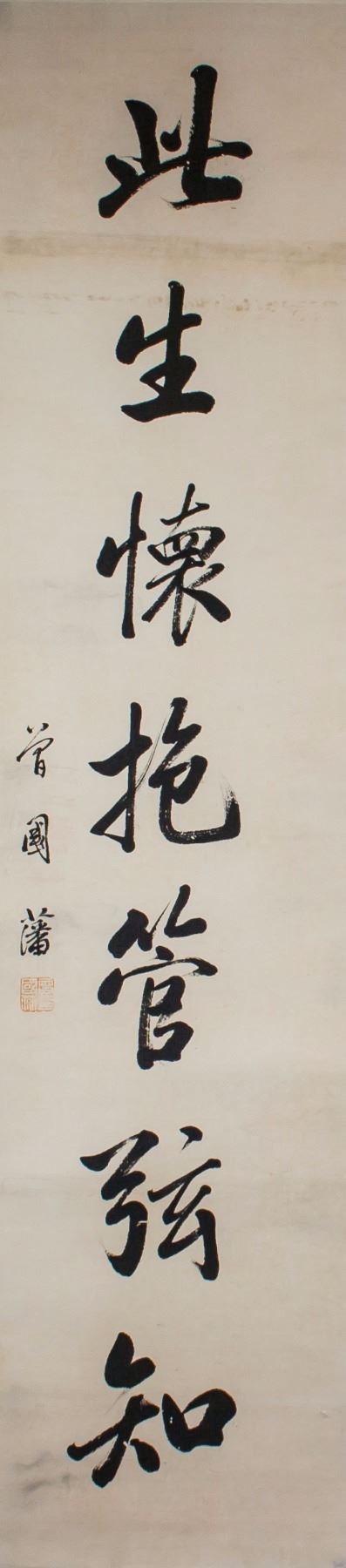 Pair of Chinese calligraphy in semi-cursive script; Chinese ink on paper roll; signed Zeng Guofan (1811-1872); inscribed with 1 seal; 136 cm x 37 cm