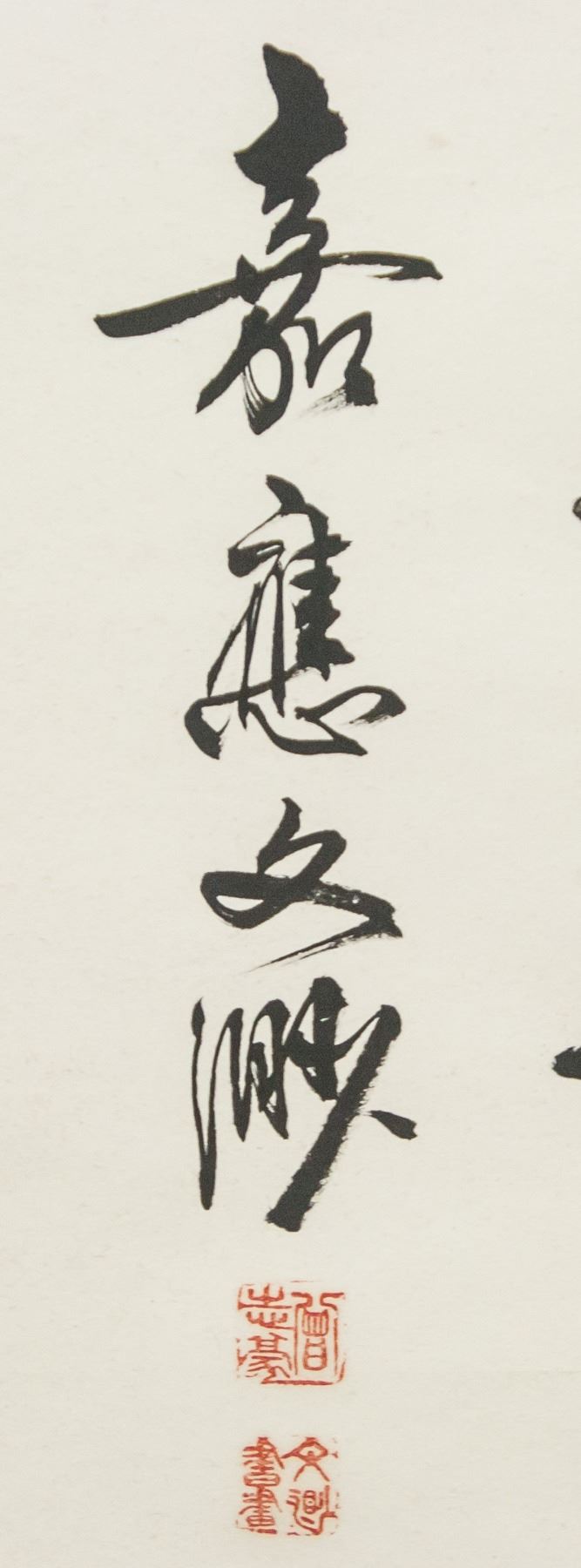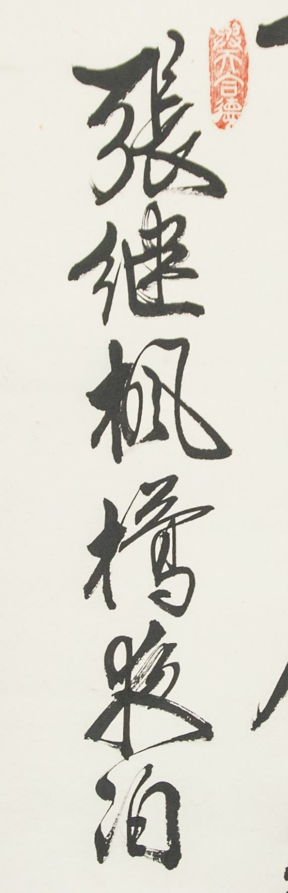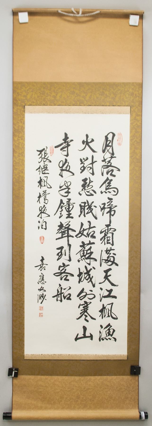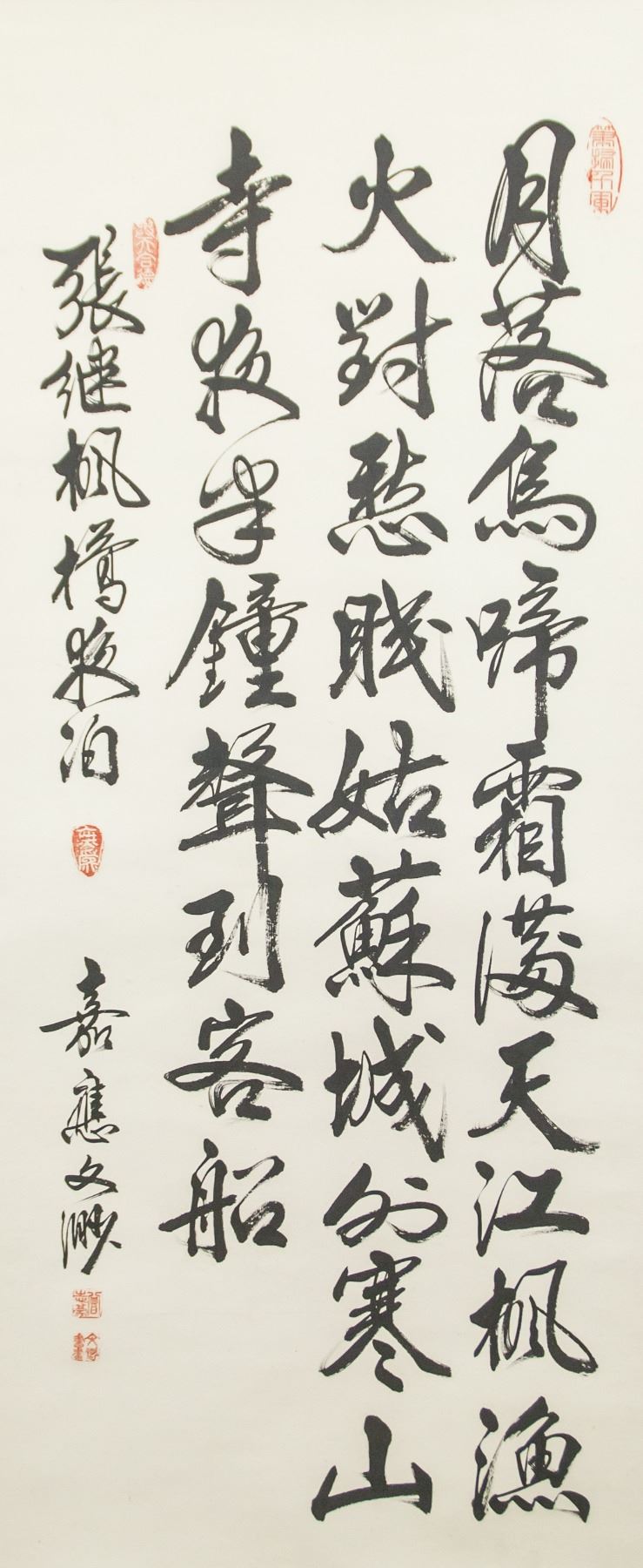 Chinese ink on paper scroll. Featuring calligraphy of Chinese Tang dynasty poem by Zhang Ji (inscribed to the top left). Signed "Jia Ying Wen Miao" in Chinese characters to the bottom left. Inscribed with five seals. One seal reads Zeng Zhihao. Attributed to Zeng Zhihao (Chinese, b.1973).102 x 44 cm. Provenance: Private collection, Philippines