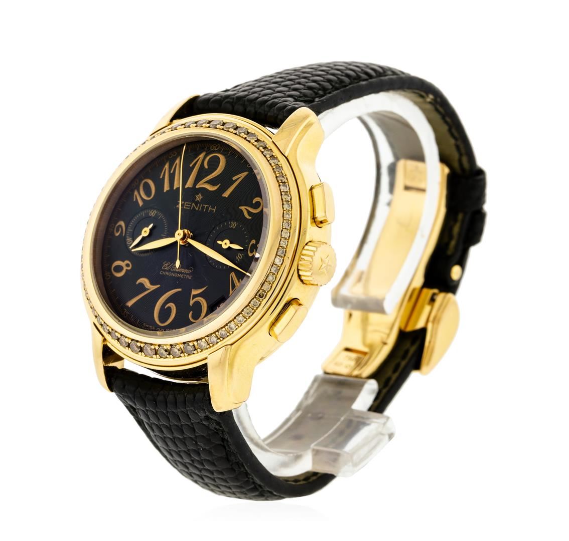 One, Zenith Chronomaster El Primero wristwatch electronically tested 18KT Rose gold, Case: 38mm diameter, Water Resistant: 30 meters / 100 feet, Exhibition Case Back: synthetic sapphire lens, the case back frame is secured by four set screws, engraved with the manufacturers information and ID numbers, Logo'd Crown, scalloped, Bezel: diamond set, Crystal: synthetic sapphire lens. Zenith signed Movement: automatic, Zenith signed Dial: Black color, pointed hands, Sub Dials: continuous seconds at the 9 o'clock position, 30 minute timer at the 3 o'clock position, Date Window 5 o'clock position, Zenith Bracelet: saddle stitched leather strap, Condition: G-6 Extra Fine. Eight inch length, adjustable. Zenith 18KT Rose gold clasp. Containing: Sixty-Four prong set round brilliant cut diamonds, approximate total weight of 64 Stones = 0.82ct. Set & graded in the bezel. Clarity: VS-2 to SI-1 Color H - I / Light Brown. Total Weight of Diamonds 0.82ct. Total Weight of Watch 112.26gm. AIG Appraised at $12,000.00.