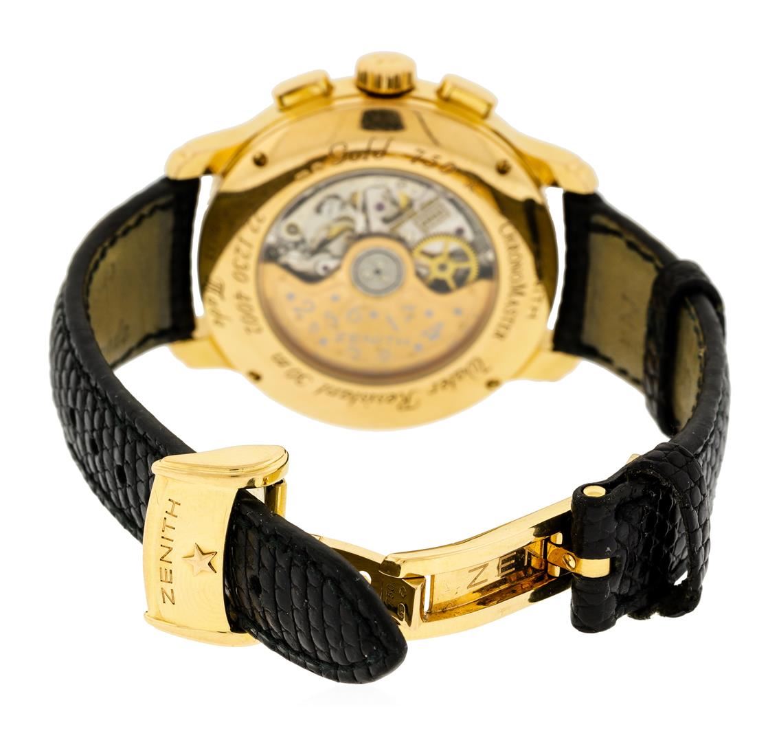 One, Zenith Chronomaster El Primero wristwatch electronically tested 18KT Rose gold, Case: 38mm diameter, Water Resistant: 30 meters / 100 feet, Exhibition Case Back: synthetic sapphire lens, the case back frame is secured by four set screws, engraved with the manufacturers information and ID numbers, Logo'd Crown, scalloped, Bezel: diamond set, Crystal: synthetic sapphire lens. Zenith signed Movement: automatic, Zenith signed Dial: Black color, pointed hands, Sub Dials: continuous seconds at the 9 o'clock position, 30 minute timer at the 3 o'clock position, Date Window 5 o'clock position, Zenith Bracelet: saddle stitched leather strap, Condition: G-6 Extra Fine. Eight inch length, adjustable. Zenith 18KT Rose gold clasp. Containing: Sixty-Four prong set round brilliant cut diamonds, approximate total weight of 64 Stones = 0.82ct. Set & graded in the bezel. Clarity: VS-2 to SI-1 Color H - I / Light Brown. Total Weight of Diamonds 0.82ct. Total Weight of Watch 112.26gm. AIG Appraised at $12,000.00.