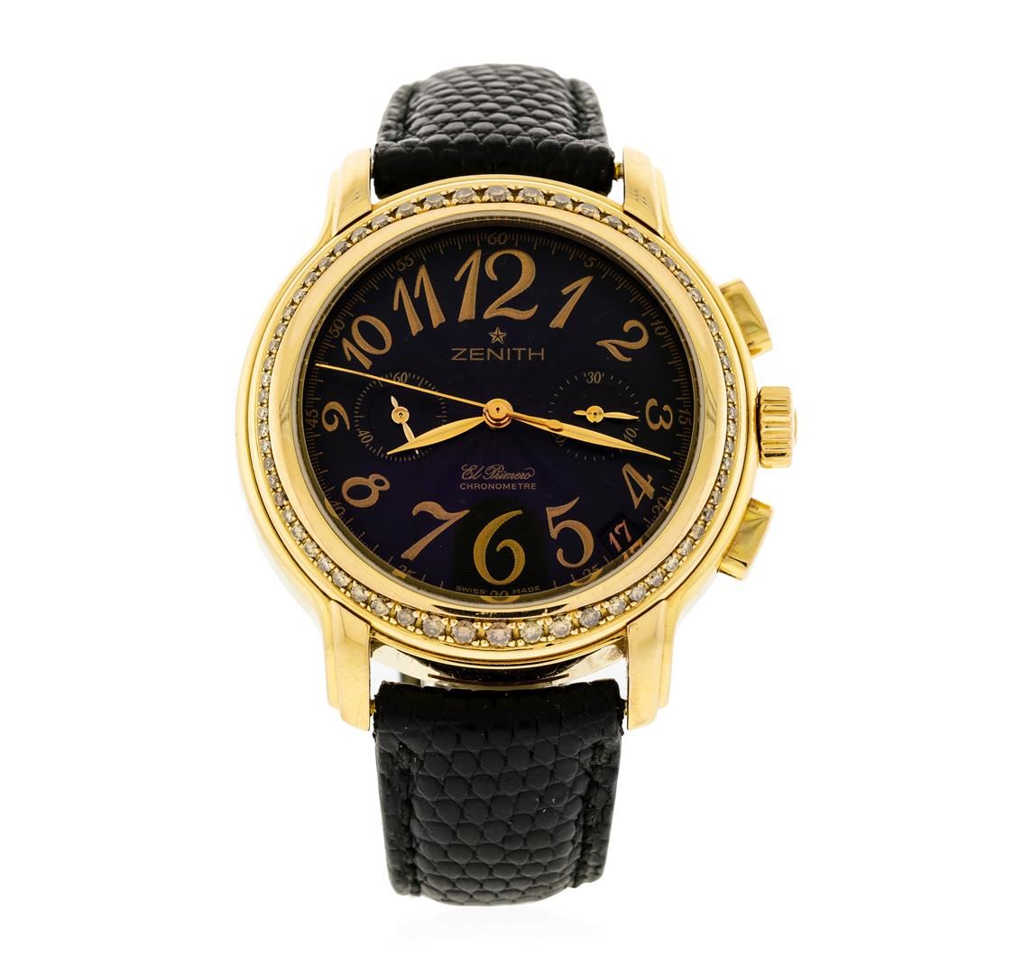 One, Zenith Chronomaster El Primero wristwatch electronically tested 18KT Rose gold, Case: 38mm diameter, Water Resistant: 30 meters / 100 feet, Exhibition Case Back: synthetic sapphire lens, the case back frame is secured by four set screws, engraved with the manufacturers information and ID numbers, Logo'd Crown, scalloped, Bezel: diamond set, Crystal: synthetic sapphire lens. Zenith signed Movement: automatic, Zenith signed Dial: Black color, pointed hands, Sub Dials: continuous seconds at the 9 o'clock position, 30 minute timer at the 3 o'clock position, Date Window 5 o'clock position, Zenith Bracelet: saddle stitched leather strap, Condition: G-6 Extra Fine. Eight inch length, adjustable. Zenith 18KT Rose gold clasp. Containing: Sixty-Four prong set round brilliant cut diamonds, approximate total weight of 64 Stones = 0.82ct. Set & graded in the bezel. Clarity: VS-2 to SI-1 Color H - I / Light Brown. Total Weight of Diamonds 0.82ct. Total Weight of Watch 112.26gm. AIG Appraised.