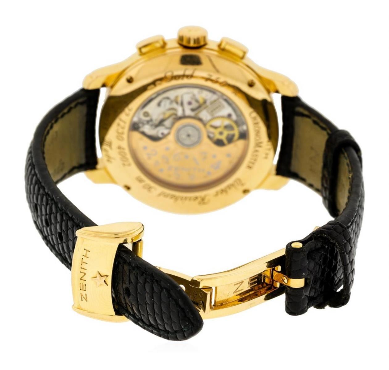 One, Zenith Chronomaster El Primero wristwatch electronically tested 18KT Rose gold, Case: 38mm diameter, Water Resistant: 30 meters / 100 feet, Exhibition Case Back: synthetic sapphire lens, the case back frame is secured by four set screws, engraved with the manufacturers information and ID numbers, Logo'd Crown, scalloped, Bezel: diamond set, Crystal: synthetic sapphire lens. Zenith signed Movement: automatic, Zenith signed Dial: Black color, pointed hands, Sub Dials: continuous seconds at the 9 o'clock position, 30 minute timer at the 3 o'clock position, Date Window 5 o'clock position, Zenith Bracelet: saddle stitched leather strap, Condition: G-6 Extra Fine. Eight inch length, adjustable. Zenith 18KT Rose gold clasp. Containing: Sixty-Four prong set round brilliant cut diamonds, approximate total weight of 64 Stones = 0.82ct. Set & graded in the bezel. Clarity: VS-2 to SI-1 Color H - I / Light Brown. Total Weight of Diamonds 0.82ct. Total Weight of Watch 112.26gm. AIG Appraised.