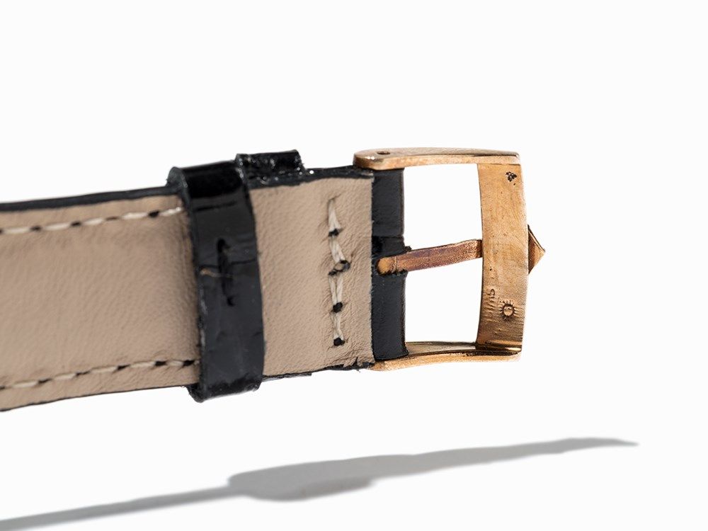 This Zenith chronograph was made in Switzerland around 1960. The watch is fitted with a manual wind movement calibre 156 and displays hour, minute, second and chronograph. The silver dial shows gold and blued hands. The watch case is made of 18K rose gold. The watch has a black leather strap with original, gold plated pin buckle. The watch case number is 132358. The watch case is hallmarked.