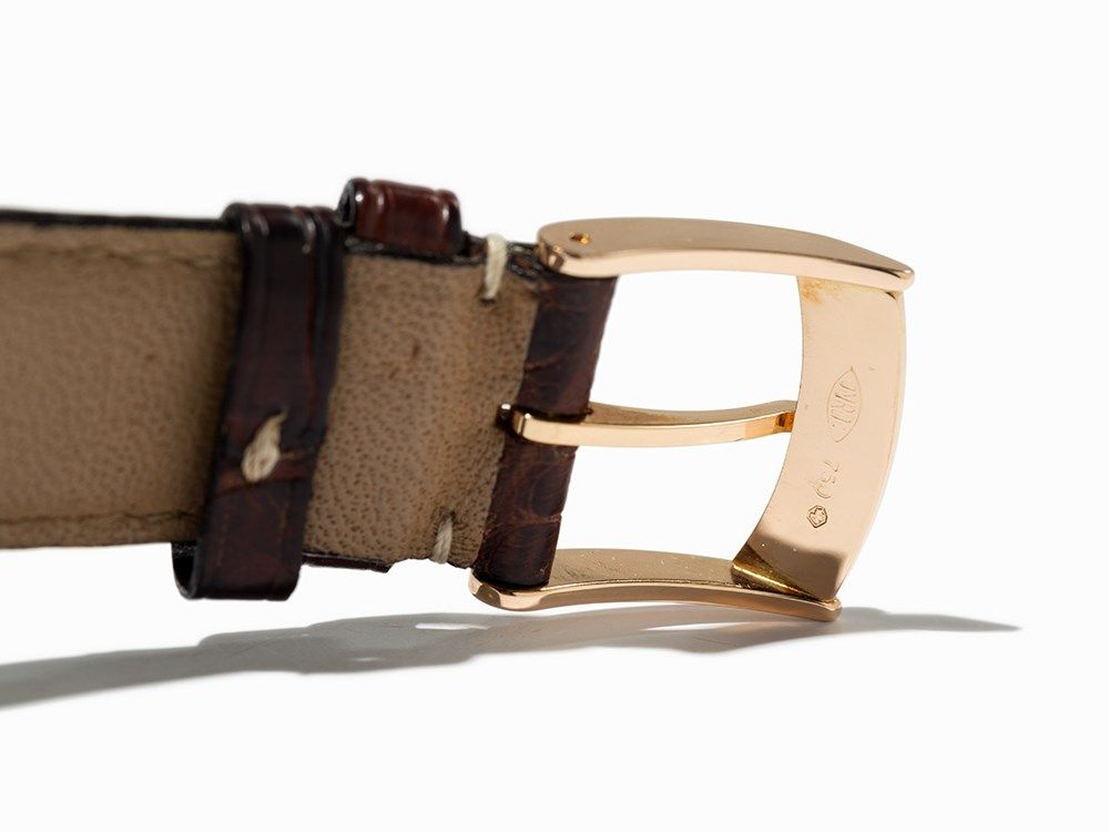 This Zenith Chronomaster moon phase chronometer, ref. 17.0240.410, was made in Switzerland in 2002. The watch is fitted with an automatic movement calibre 410Z with 31 jewels and displays hour, minute, second, chronograph, full calendar and moon phase. The silver guilloche dial shows gold hands. Watch case and original pin buckle are made of 18K rose gold. The watch has an original, brown leather strap and a sapphire glass bottom. The movement number is 139350. The chronometer number is 15141. Watch case and clasp are hallmarked.