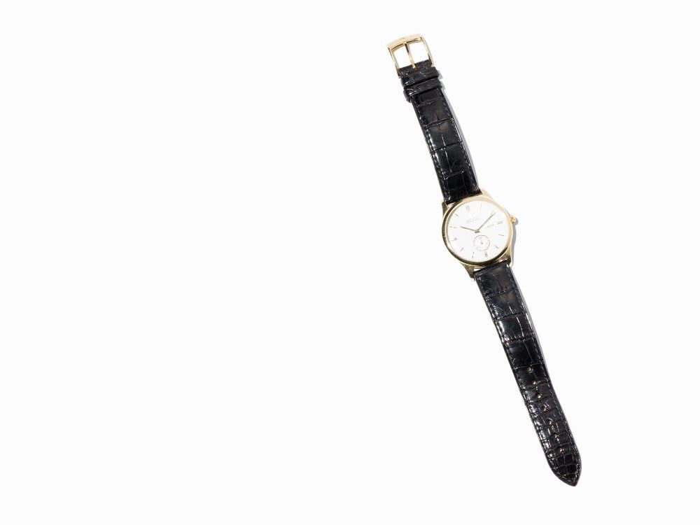 This Zenith chronometer wristwatch no. 33, ref. 30.2125.113, was made in Switzerland around 1965. The watch is limited, no. 033/300 and is fitted with a manual wind movement calibre 2541 with 17 jewels. It displays hour, minute and second. The white enamel dial shows gold hands. The watch case and original pin buckle are made of 18K gold. The watch has an original, black leather strap. The movement number is 35799. The watch case and clasp are hallmarked.