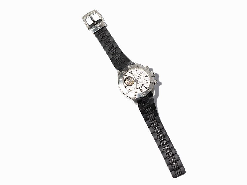 The watch case measures 46 mm in diameter and 16 mm in height. The strap is 22 cm long. The watch weighs 165 grams. The timepiece is in very good condition with minimal traces of wear. During in house testing the watch was fully functional. Long-term precision and regularity cannot be guaranteed. The watch ships with original box and original certificate.