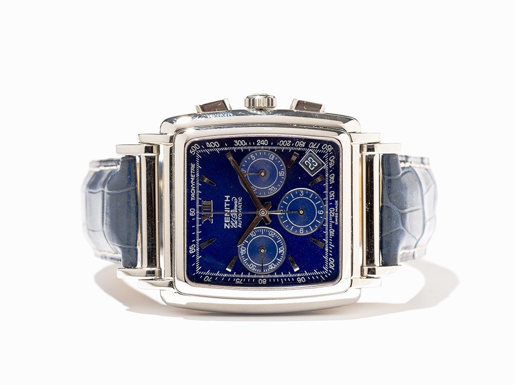 This Zenith El Primero chronograph, ref. 01.0420.400, was made in Switzerland around 1995. The watch is fitted with an automatic movement Zenith calibre 400 with 31 jewels and displays hour, minute, second, date and chronograph. The blue dial shows silver hands. Watch case and original pin buckle are made of stainless steel. The watch has an original, blue leather strap.