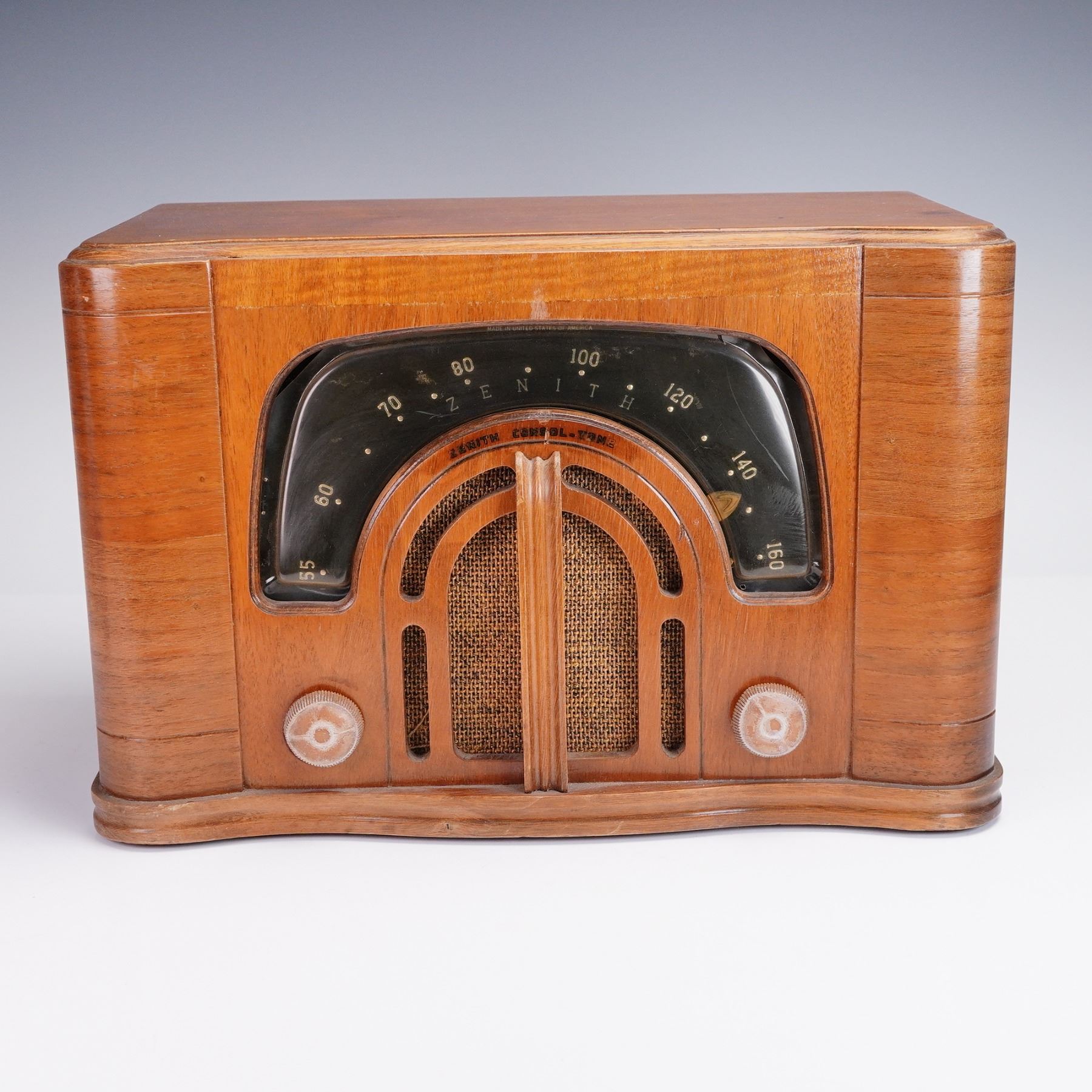 Vintage Zenith Model 6D629 radio with Console Tone circuitry, manufactured circa 1940s. This tabletop tube radio features a classic curved Art Deco-style walnut cabinet with carved vertical accents and an arched grille over woven speaker cloth. The black dial scale with white numerals ranges from 55 to 160, with the Zenith name prominently centered above the frequency display. Rear panel is stamped with model and voltage specs, indicating 117V AC-DC and 30W usage. A fine representation of midcentury American radio design. Measures approx. 12.25"L x 8.75"H.