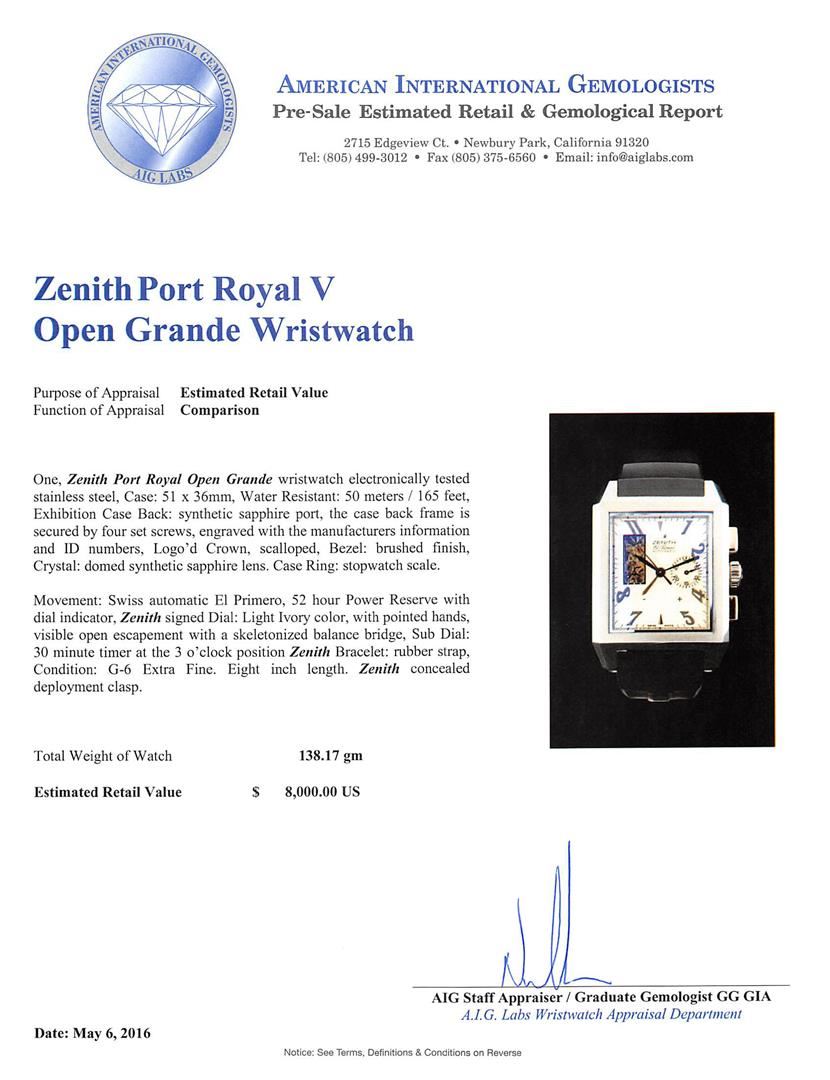One, Zenith Port Royal Open Grande wristwatch electronically tested stainless steel, Case: 51 x 36mm, Water Resistant: 50 meters / 165 feet, Exhibition Case Back: synthetic sapphire port, the case back frame is secured by four set screws, engraved with the manufacturers information and ID numbers, Logo'd Crown, scalloped, Bezel: brushed finish, Crystal: domed synthetic sapphire lens. Case Ring: stopwatch scale. Movement: Swiss automatic El Primero, 52 hour Power Reserve with dial indicator, Zenith signed Dial: Light Ivory color, with pointed hands, visible open escapement with a skeletonized balance bridge, Sub Dial: 30 minute timer at the 3 o'clock position Zenith Bracelet: rubber strap, Condition: G-6 Extra Fine. Eight inch length. Zenith concealed deployment clasp. Total Weight of Watch 138.17gm. AIG Appraised at $8,000.00.