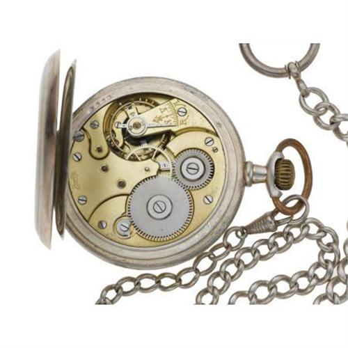 <B>Zenith Silver Openface Pocket Watch with Accompanying Chain, circa 1910</B></I> <BR><BR>Case: 52 mm, hinged, circular 800 silver, with smooth edge, marked Zenith 3002<BR>Dial: white enamel with black Arabic numerals, goldtone "Louis XIV" hour and minute hand, sunken auxiliary sweep seconds and mineral crystal<BR>Movement: simple gilt movement marked Zenith<BR>Double signed Zenith on the case and movement.<BR>Caseback is monogrammed, HS.<BR>Notes: Watch is currently in working order. It suspends from an 800 silver chain.<BR><BR> <B>Condition Report:</B> Normal signs of wear as appropriate with age. Reference #3002 appears on the outer case, dustcover and case edge around movement. Watch is in working order. A few minor dents noted along smooth case edge.<BR><BR><b>Shipping:</b> Miscellaneous Collectibles, Smal (<a target="_blank" href="http://www.heritageauctions.com/common/shipping.php">view shipping information</a>)