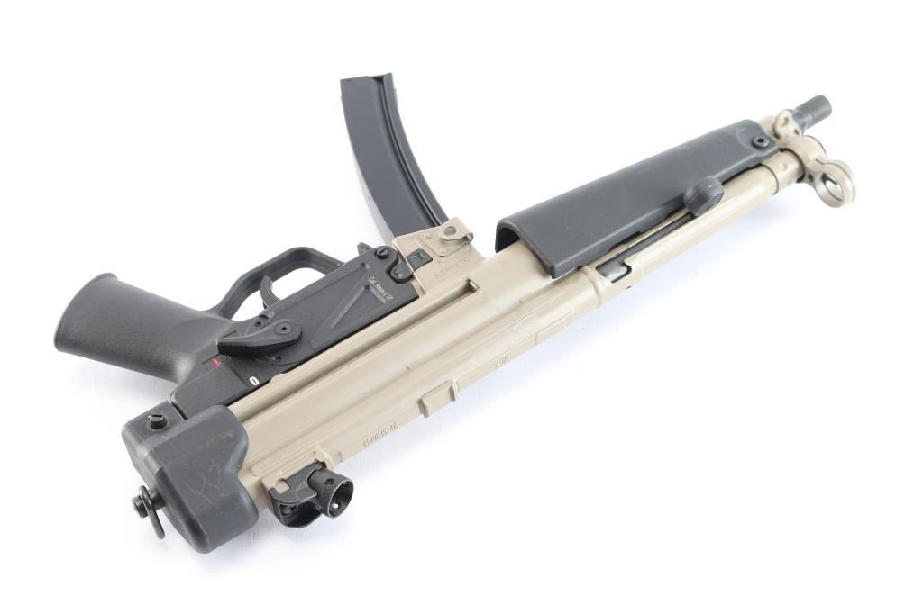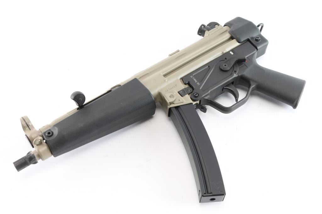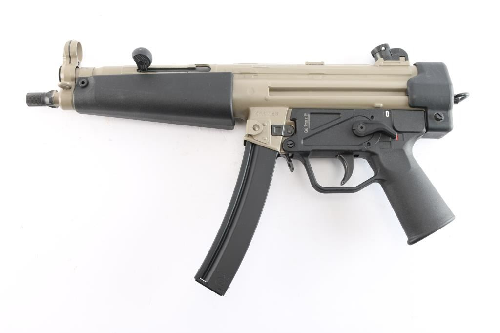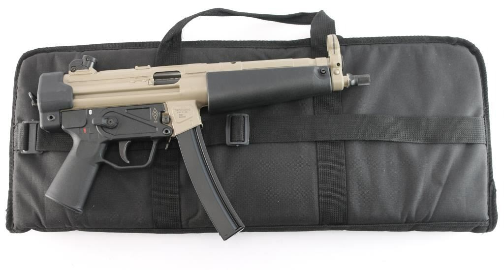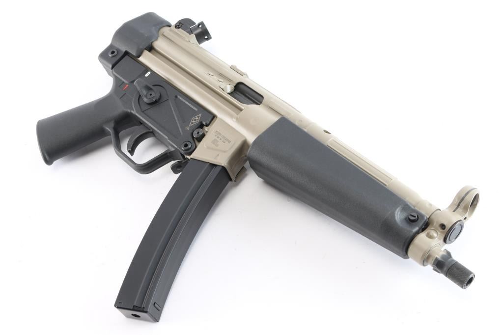 American made roller-delayed blowback semi-automatic centerfire pistol chambered for 9x19mm, manufactured in Afton, VA. This is an American copy of HK's MP5/SP5 pistol. Pistol features an Flat Dark Earth (FDE) finish, a 8.9" cold-hammer forged 4150 CMV barrel, tri-lug and 1/2-28 threads for muzzle devices, knurled thread protector, fixed post hooded front sight, adjustable four-aperture rotary drum rear sight, smooth curved trigger, ambidextrous paddle magazine release, annular cut right side push-button safety, checkered cocking handle, black polymer trigger housing with smooth pistol grip, smooth wide tropical handguard, optic mounting lugs on the top of the receiver, sling loop on the left side of the front sight base, sling loop on left side of magazine well, and sling ring at the rear of the firearm. The original FDE finish retained is approximately 99% with minimal chipping around the magazine well. Metal displays no rust or deformation. Bore is bright with strong rifling, and the action is smooth and crisp. The black polymer parts are also excellent. Pistol includes tactical soft case, owner's manual, cleaning kit, extra parts, lock, and one magazine total.