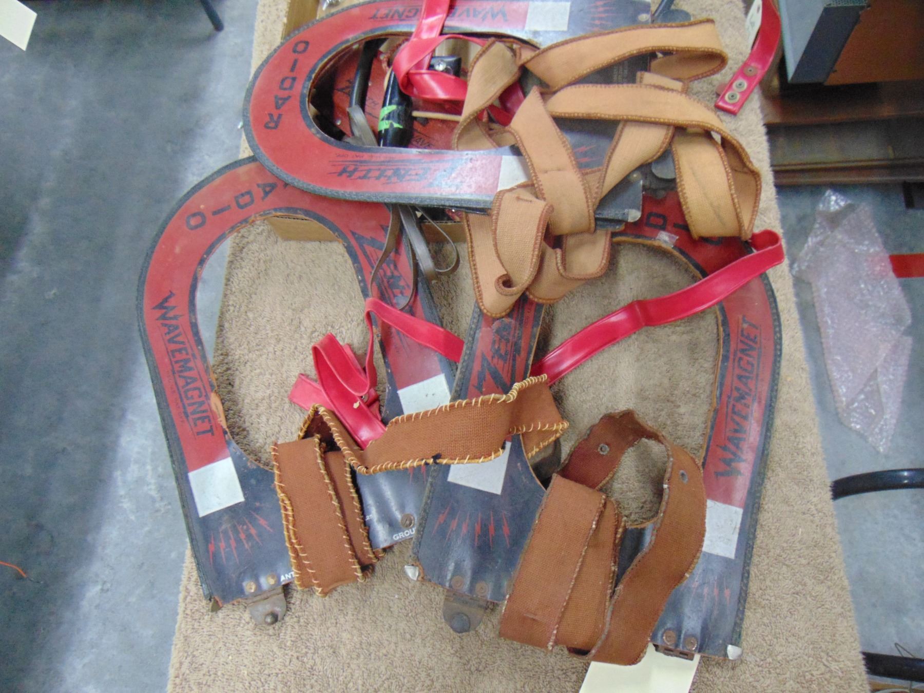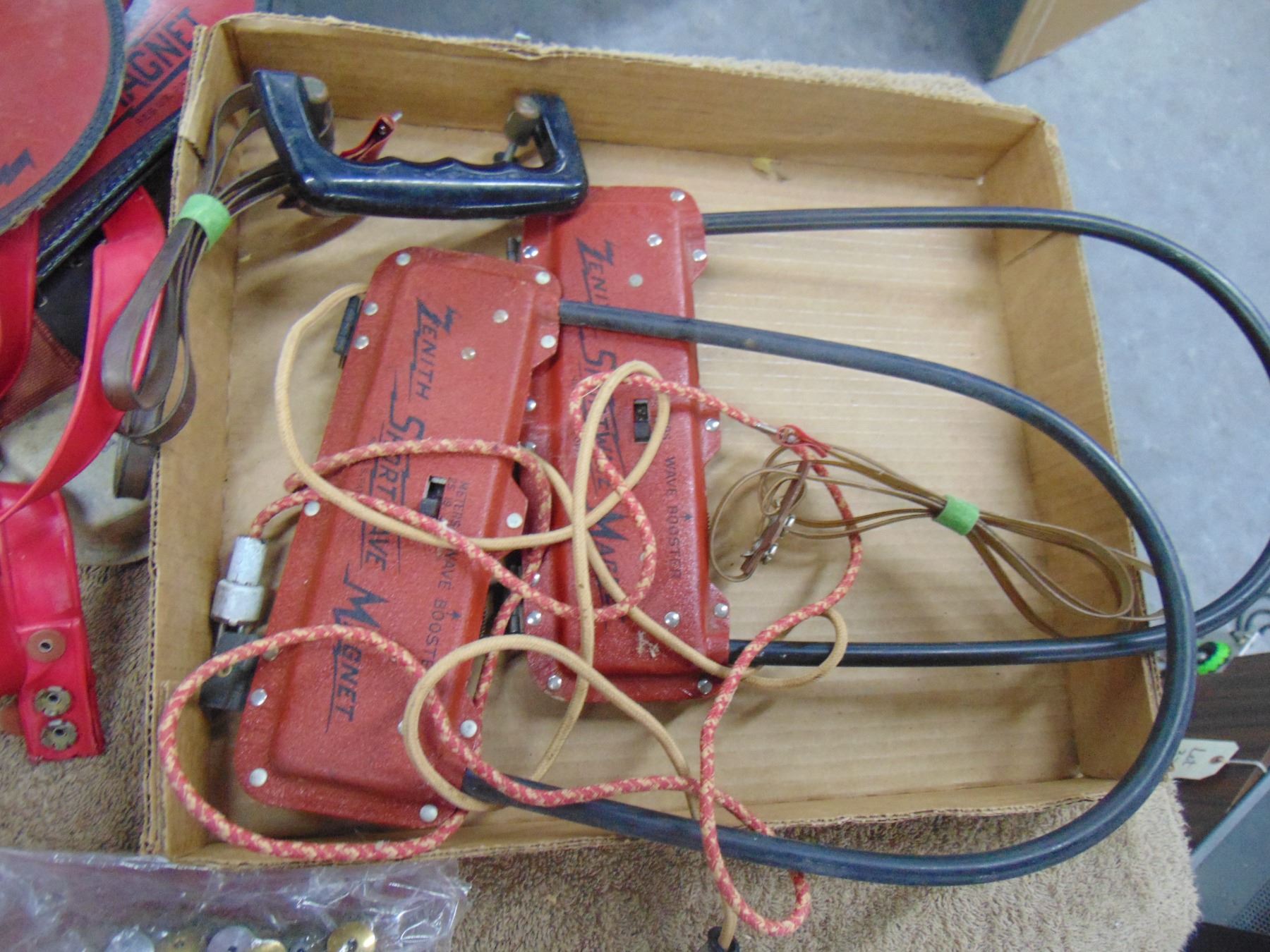 Flat of misc. Zenith Transoceanic parts; 6 wave magnets for various models; good
