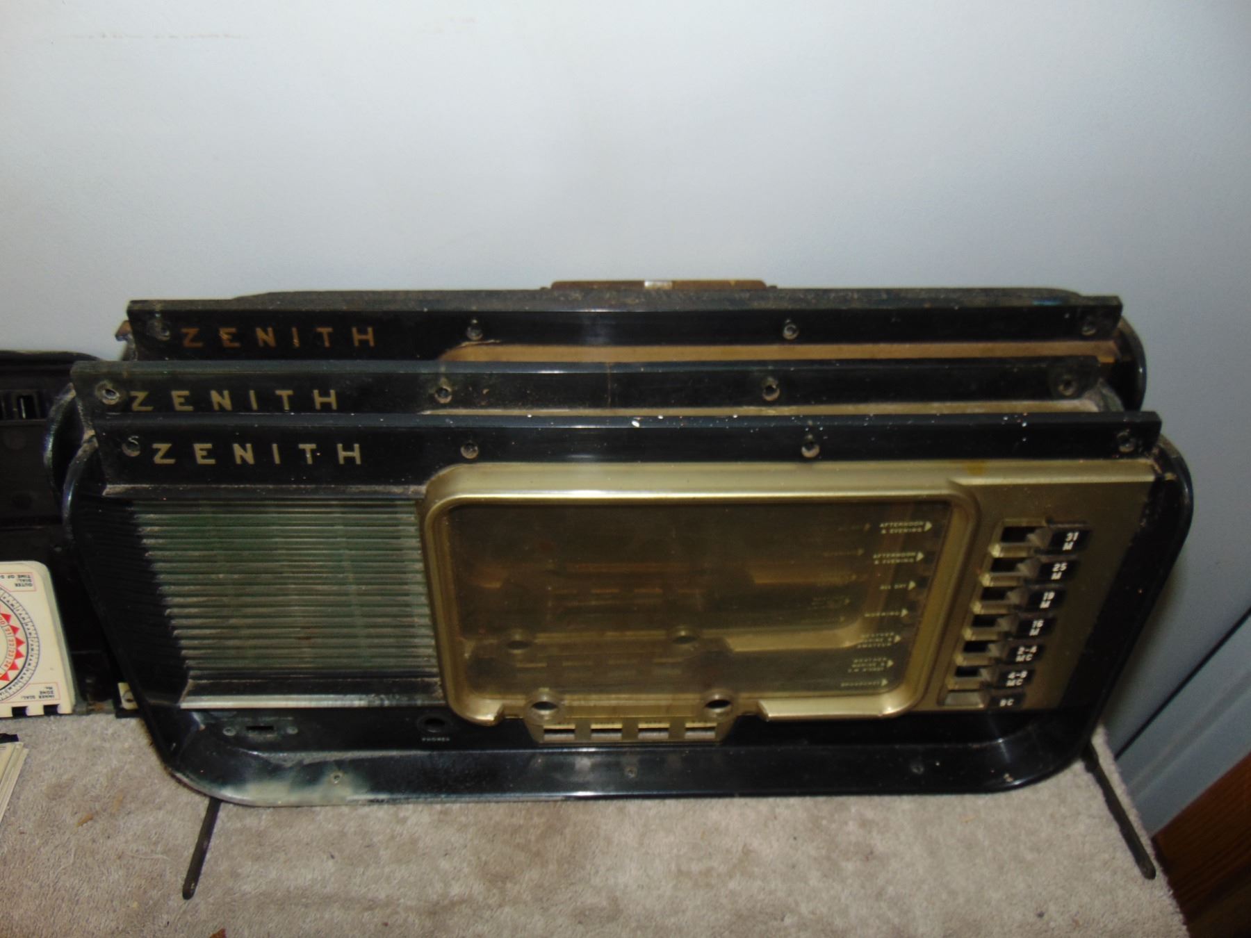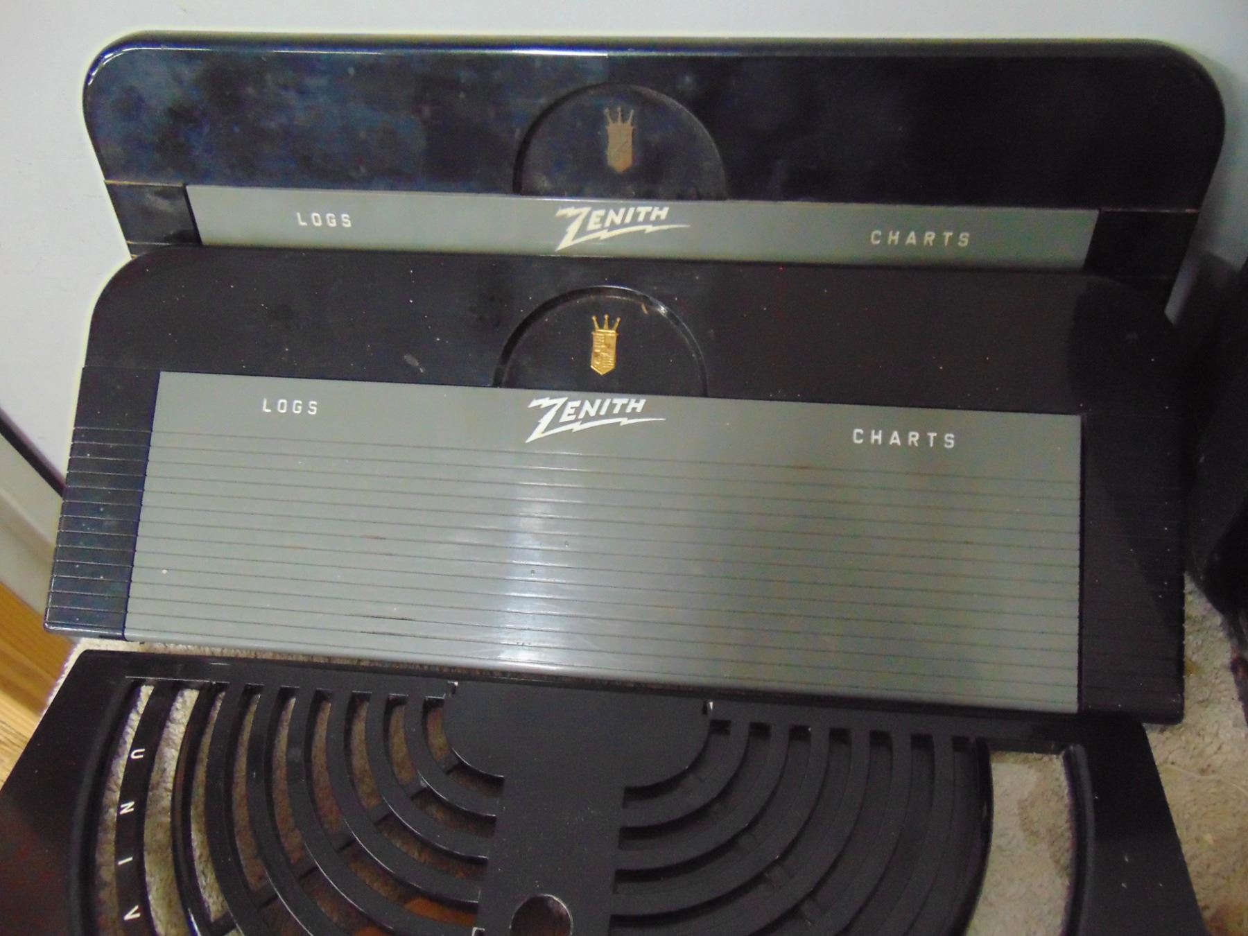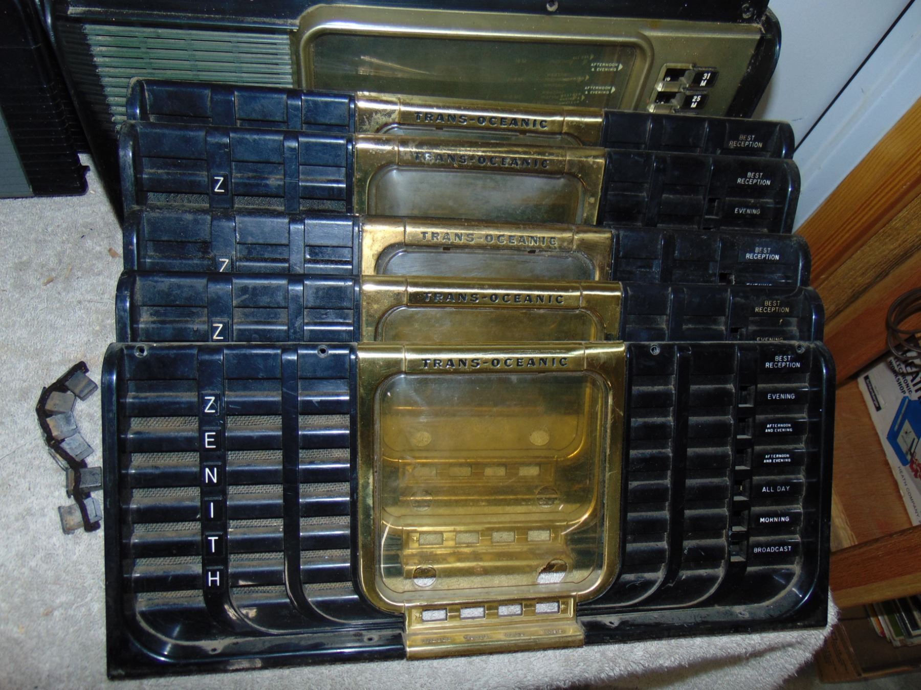 Flat of front panels and misc. parts for Zenith Transoceanic models G-500 and 600 series; also log books