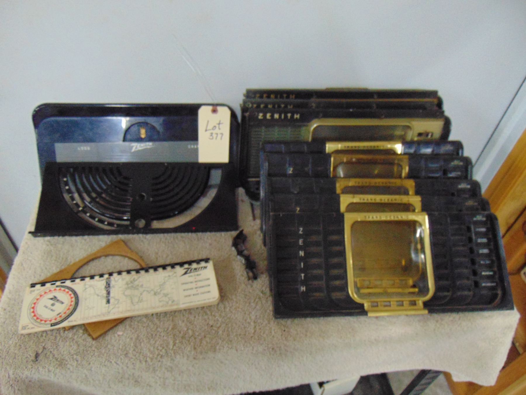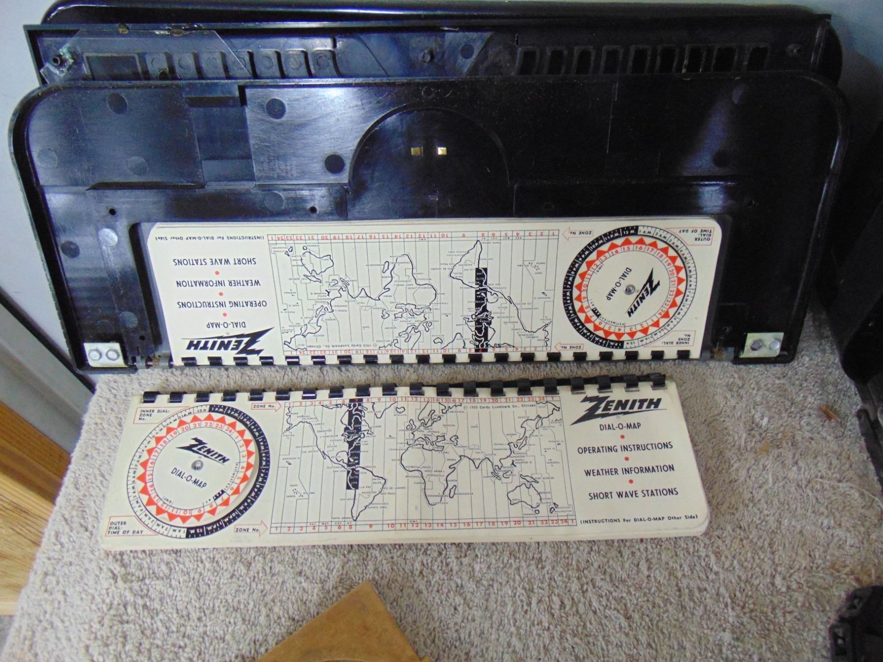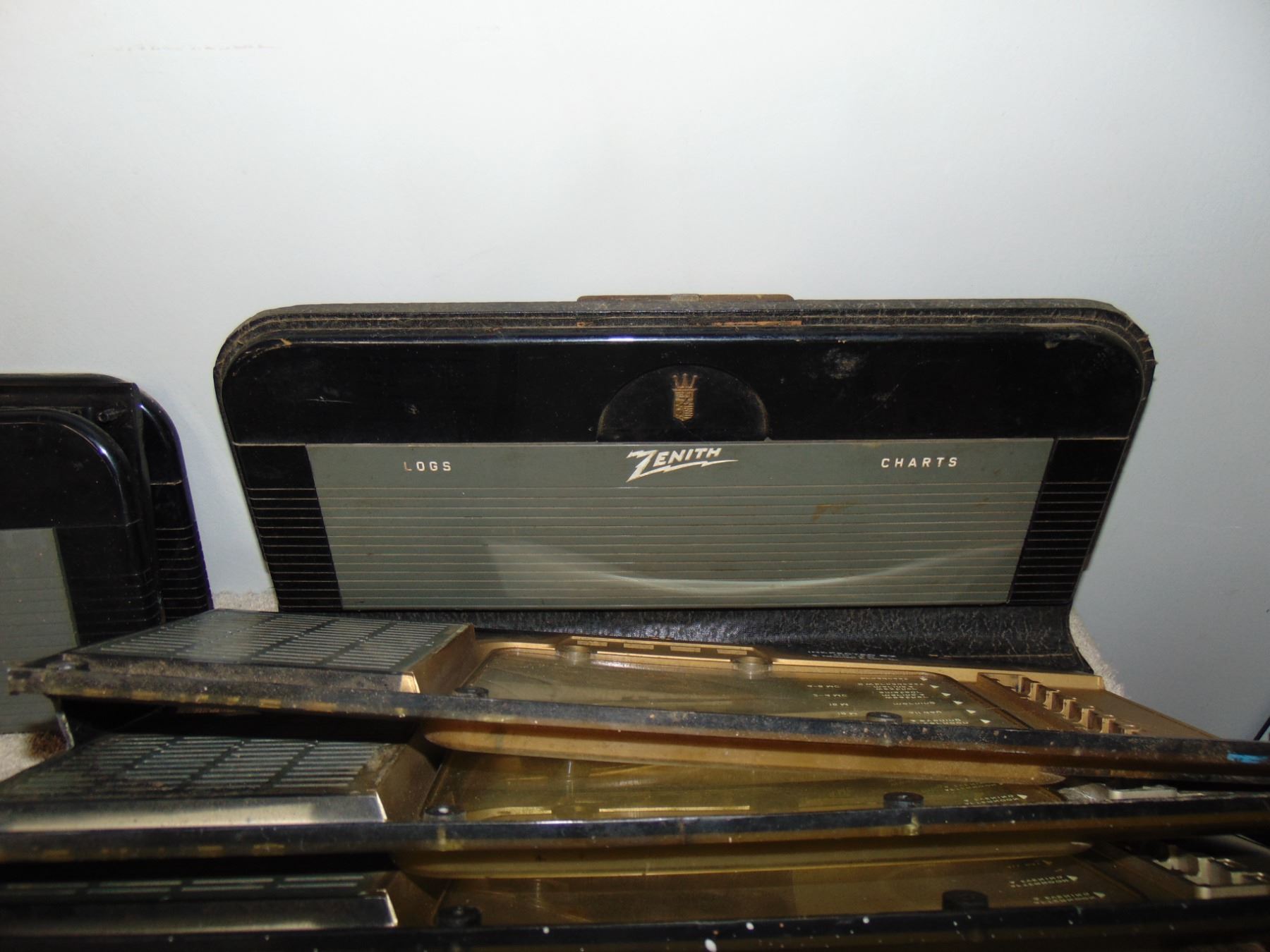 Flat of front panels and misc. parts for Zenith Transoceanic models G-500 and 600 series; also log books