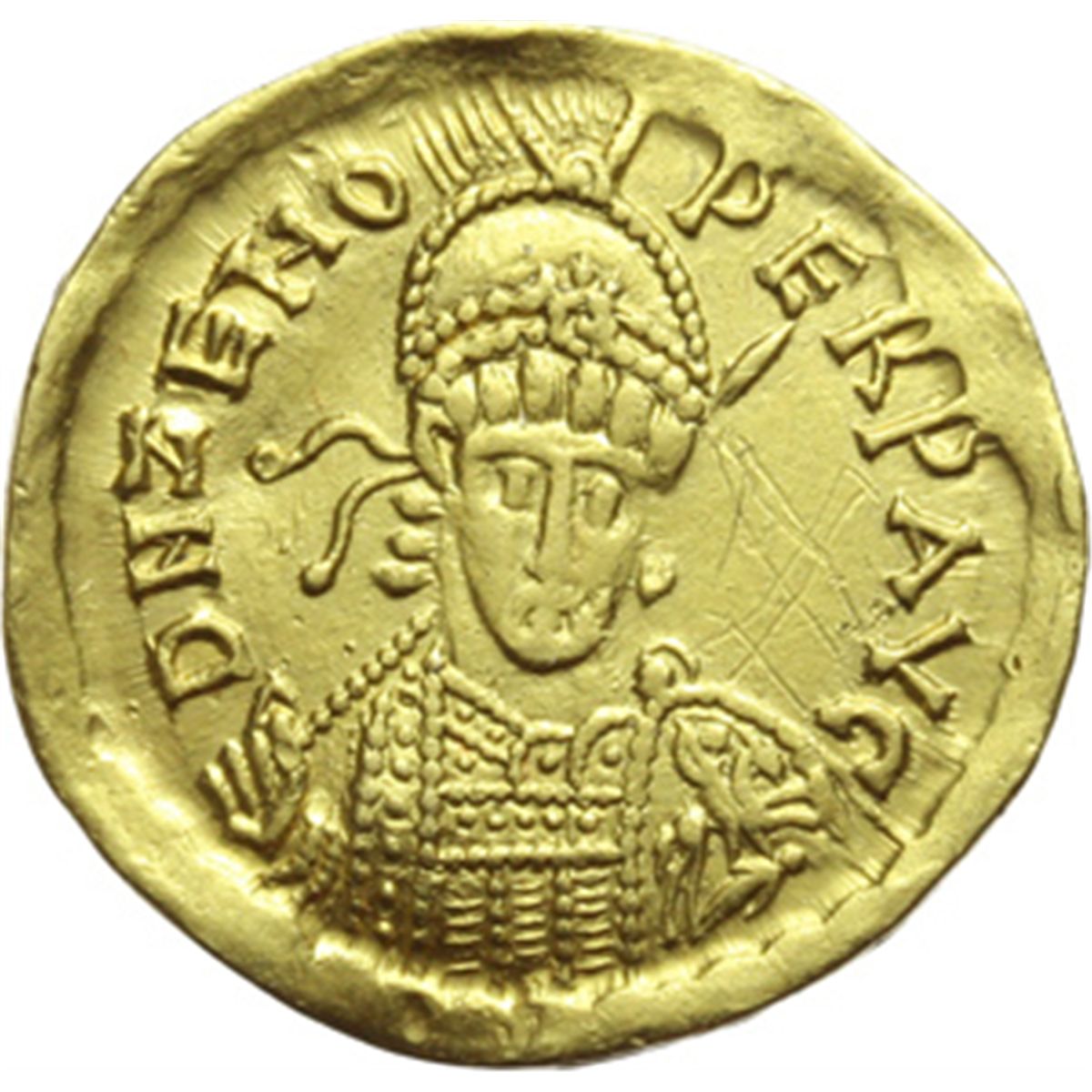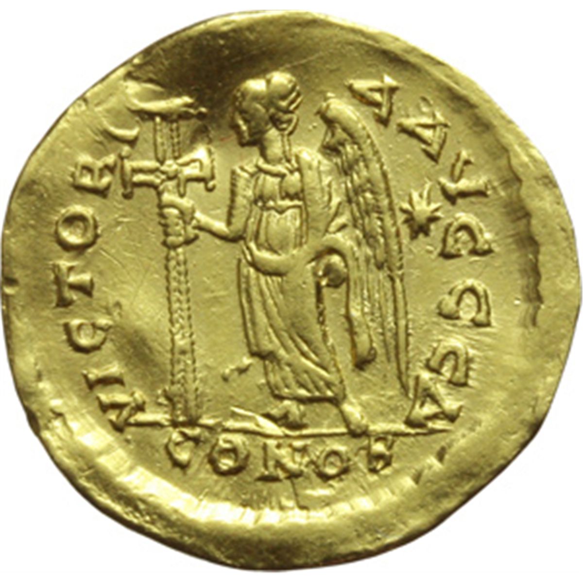 Impero Romano. Zeno (474-491). Solido, Costantinopoli. D/ DN ZENO PERP AVG. Busto elmato e corazzato di fronte tiene lancia e scudo. R/ VICTORIA AVGGG Δ. Vittoria stante a sinistra tiene lunga croce. A destra, stella. In esergo: CONOB. LRC 633. AU. g. 4.21 mm. 20.00 BB.