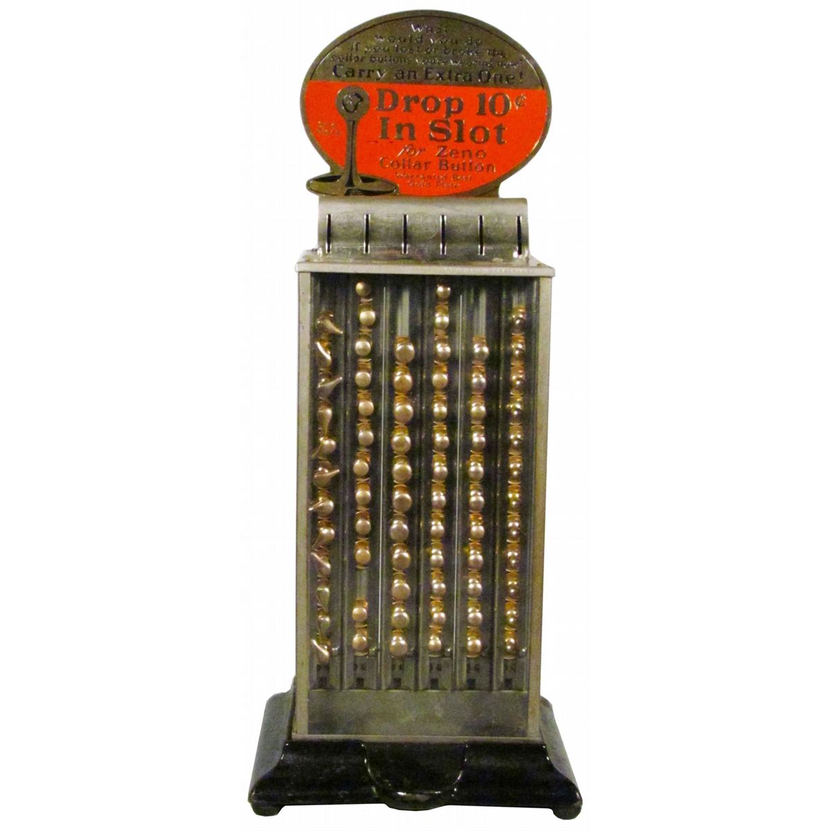 Zeno Collar Button Dispenser. 1905, dime version. Comes with product and a key. Replacement marquee otherwise very good original condition. 14 inches tall.