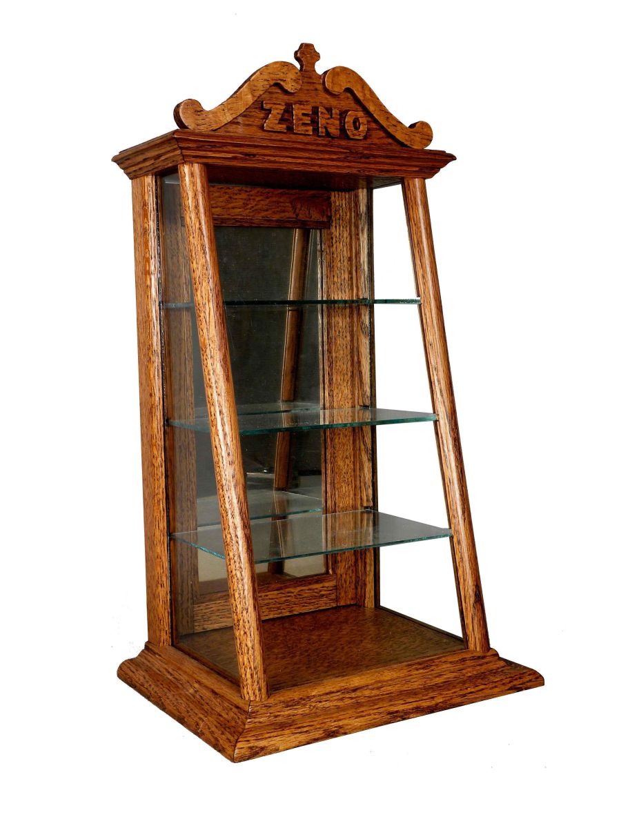 Zeno Gum store counter showcase, oak with three glass shelves. Earlier restoration with reproduction marquee. Excellent condition. 10 X 17 X 7 1/2 inches.
