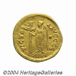 Zeno I. Second reign, A.D. 476-491. AV solidus (21 mm, 4.42 g). Constantinople. Diademed, helmeted and cuirassed three-quarter bust facing slightly right, holding spear over right shoulder and on left arm shield decorated with a horseman spearing fallen enemy / Victory standing left, holding long jeweled cross in right hand; star in right field; S/CONOB. RIC 911; Depeyrot 108/1. Fine. Important notice: Heritage usually auctions material at the rate of 200-250 lots per hour. On some occasions eBay Live bid software or the Internet may not be able to keep up with the pace of the auction. We recommend placing a realistic absentee bid now as insurance to avoid disappointment. Occasionally the auctioneer may eliminate or reject an eBay Live bid, and the auctioneer may also reopen a lot after the close of the eBay live bidding (usually because we missed an audience bid), and may reject your bid even if it shows you as the winning bidder. By bidding via eBay Live, you agree that Heritage may award the lot to another bidder at its sole discretion under the circumstances described above or any other reasonable circumstances. Also please note that all Heritage lots purchased through eBay Live carry a 20% Buyer's Premium. Please make sure you read the Terms and Conditions before you bid.