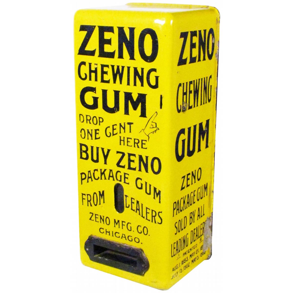 Zeno Yellow Porcelain Gum Vendor. Patent 1902. This mustard color is the only one we have ever seen. Some slight edgeware and paint loss bottom right side otherwise very good all original condition, comes with key. 7 X 16 1/2 X 5 1/2 inches.