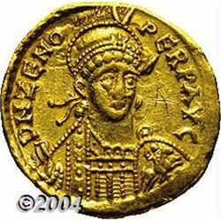 <B>Zeno.</B></I> A.D. 474-491. AV solidus (20 mm, 4.47 g). Constantinople. Diademed, helmeted and cuirassed bust facing slightly right, holding spear and shield decorated with a horseman spearing fallen enemy / Victory standing left, holding long jewelled cross; star in right field; (Gamma)/CONOB. RIC 910; Depeyrot 108/1. VF, obverse graffito. <BR><I>From the Geneva Collection.</B></I> <BR><BR><B>Important notice:</B> Heritage usually auctions material at the rate of 200-250 lots per hour. On some occasions eBay Live bid software or the Internet may not be able to keep up with the pace of the auction. We recommend placing a realistic absentee bid now as insurance to avoid disappointment. Occasionally the auctioneer may eliminate or reject an eBay Live bid, and the auctioneer may also reopen a lot after the close of the eBay live bidding (usually because we missed an audience bid), and may reject your bid even if it shows you as the winning bidder. By bidding via eBay Live, you agree that Heritage may award the lot to another bidder at its sole discretion under the circumstances described above or any other reasonable circumstances. Since eBay bids are not shown to us until we open the lot on the floor, we treat those bids just like floor bids. In most cases the floor responds before the eBay bid is presented to us, due to Internet lag time, so for consistency we have made it a policy that floor bids are always considered first over tie eBay live bids. Also please note that all Heritage lots purchased through eBay Live carry a 20% Buyer's Premium. Please make sure you read the Terms and Conditions before you bid.