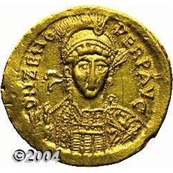 <B>Zeno.</B></I> A.D. 474-491. AV solidus (20 mm, 4.47 g). Constantinople. Diademed, helmeted and cuirassed bust facing slightly right, holding spear and shield decorated with a horseman spearing fallen enemy / Victory standing left, holding long jewelled cross; star in right field; S(retrograde)/CONOB. RIC 911; Depeyrot 108/1. Lustrous, Near XF, obverse graffito. <BR><I>From the Geneva Collection.</B></I> <BR><BR><B>Important notice:</B> Heritage usually auctions material at the rate of 200-250 lots per hour. On some occasions eBay Live bid software or the Internet may not be able to keep up with the pace of the auction. We recommend placing a realistic absentee bid now as insurance to avoid disappointment. Occasionally the auctioneer may eliminate or reject an eBay Live bid, and the auctioneer may also reopen a lot after the close of the eBay live bidding (usually because we missed an audience bid), and may reject your bid even if it shows you as the winning bidder. By bidding via eBay Live, you agree that Heritage may award the lot to another bidder at its sole discretion under the circumstances described above or any other reasonable circumstances. Since eBay bids are not shown to us until we open the lot on the floor, we treat those bids just like floor bids. In most cases the floor responds before the eBay bid is presented to us, due to Internet lag time, so for consistency we have made it a policy that floor bids are always considered first over tie eBay live bids. Also please note that all Heritage lots purchased through eBay Live carry a 20% Buyer's Premium. Please make sure you read the Terms and Conditions before you bid.