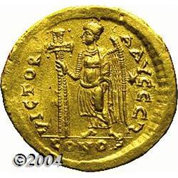 <B>Zeno.</B></I> A.D. 474-491. AV solidus (20 mm, 4.47 g). Constantinople. Diademed, helmeted and cuirassed bust facing slightly right, holding spear and shield decorated with a horseman spearing fallen enemy / Victory standing left, holding long jewelled cross; star in right field; S(retrograde)/CONOB. RIC 911; Depeyrot 108/1. Lustrous, Near XF, obverse graffito. <BR><I>From the Geneva Collection.</B></I> <BR><BR><B>Important notice:</B> Heritage usually auctions material at the rate of 200-250 lots per hour. On some occasions eBay Live bid software or the Internet may not be able to keep up with the pace of the auction. We recommend placing a realistic absentee bid now as insurance to avoid disappointment. Occasionally the auctioneer may eliminate or reject an eBay Live bid, and the auctioneer may also reopen a lot after the close of the eBay live bidding (usually because we missed an audience bid), and may reject your bid even if it shows you as the winning bidder. By bidding via eBay Live, you agree that Heritage may award the lot to another bidder at its sole discretion under the circumstances described above or any other reasonable circumstances. Since eBay bids are not shown to us until we open the lot on the floor, we treat those bids just like floor bids. In most cases the floor responds before the eBay bid is presented to us, due to Internet lag time, so for consistency we have made it a policy that floor bids are always considered first over tie eBay live bids. Also please note that all Heritage lots purchased through eBay Live carry a 20% Buyer's Premium. Please make sure you read the Terms and Conditions before you bid.