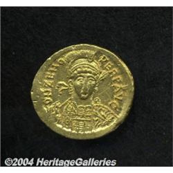 <B>Zeno.</B></I> A.D. 474-491. AV solidus (20 mm, 4.47 g). Constantinople. Diademed, helmeted and cuirassed bust facing slightly right, holding spear and shield decorated with a horseman spearing fallen enemy / Victory standing left, holding long jewelled cross; star in right field; S(retrograde)/CONOB. RIC 911; Depeyrot 108/1. Lustrous, Near XF, obverse graffito. <BR><I>From the Geneva Collection.</B></I> <BR><BR><B>Important notice:</B> Heritage usually auctions material at the rate of 200-250 lots per hour. On some occasions eBay Live bid software or the Internet may not be able to keep up with the pace of the auction. We recommend placing a realistic absentee bid now as insurance to avoid disappointment. Occasionally the auctioneer may eliminate or reject an eBay Live bid, and the auctioneer may also reopen a lot after the close of the eBay live bidding (usually because we missed an audience bid), and may reject your bid even if it shows you as the winning bidder. By bidding via eBay Live, you agree that Heritage may award the lot to another bidder at its sole discretion under the circumstances described above or any other reasonable circumstances. Since eBay bids are not shown to us until we open the lot on the floor, we treat those bids just like floor bids. In most cases the floor responds before the eBay bid is presented to us, due to Internet lag time, so for consistency we have made it a policy that floor bids are always considered first over tie eBay live bids. Also please note that all Heritage lots purchased through eBay Live carry a 20% Buyer's Premium. Please make sure you read the Terms and Conditions before you bid.