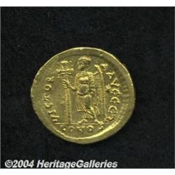 <B>Zeno.</B></I> A.D. 474-491. AV solidus (20 mm, 4.47 g). Constantinople. Diademed, helmeted and cuirassed bust facing slightly right, holding spear and shield decorated with a horseman spearing fallen enemy / Victory standing left, holding long jewelled cross; star in right field; S(retrograde)/CONOB. RIC 911; Depeyrot 108/1. Lustrous, Near XF, obverse graffito. <BR><I>From the Geneva Collection.</B></I> <BR><BR><B>Important notice:</B> Heritage usually auctions material at the rate of 200-250 lots per hour. On some occasions eBay Live bid software or the Internet may not be able to keep up with the pace of the auction. We recommend placing a realistic absentee bid now as insurance to avoid disappointment. Occasionally the auctioneer may eliminate or reject an eBay Live bid, and the auctioneer may also reopen a lot after the close of the eBay live bidding (usually because we missed an audience bid), and may reject your bid even if it shows you as the winning bidder. By bidding via eBay Live, you agree that Heritage may award the lot to another bidder at its sole discretion under the circumstances described above or any other reasonable circumstances. Since eBay bids are not shown to us until we open the lot on the floor, we treat those bids just like floor bids. In most cases the floor responds before the eBay bid is presented to us, due to Internet lag time, so for consistency we have made it a policy that floor bids are always considered first over tie eBay live bids. Also please note that all Heritage lots purchased through eBay Live carry a 20% Buyer's Premium. Please make sure you read the Terms and Conditions before you bid.