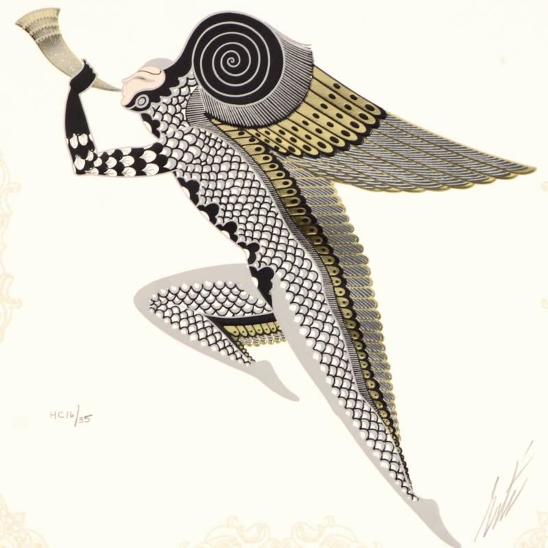 "Zephyr Gold" is a limited edition serigraph on paper by Erte (1892-1990), numbered and hand signed by the artist. Includes Certificate of Authenticity. Measures approx. 12.5" x 12.5" (border), 12" x 12" (image). Due to the age of this piece and the delicate nature of the paper it may have some slight imperfections.
