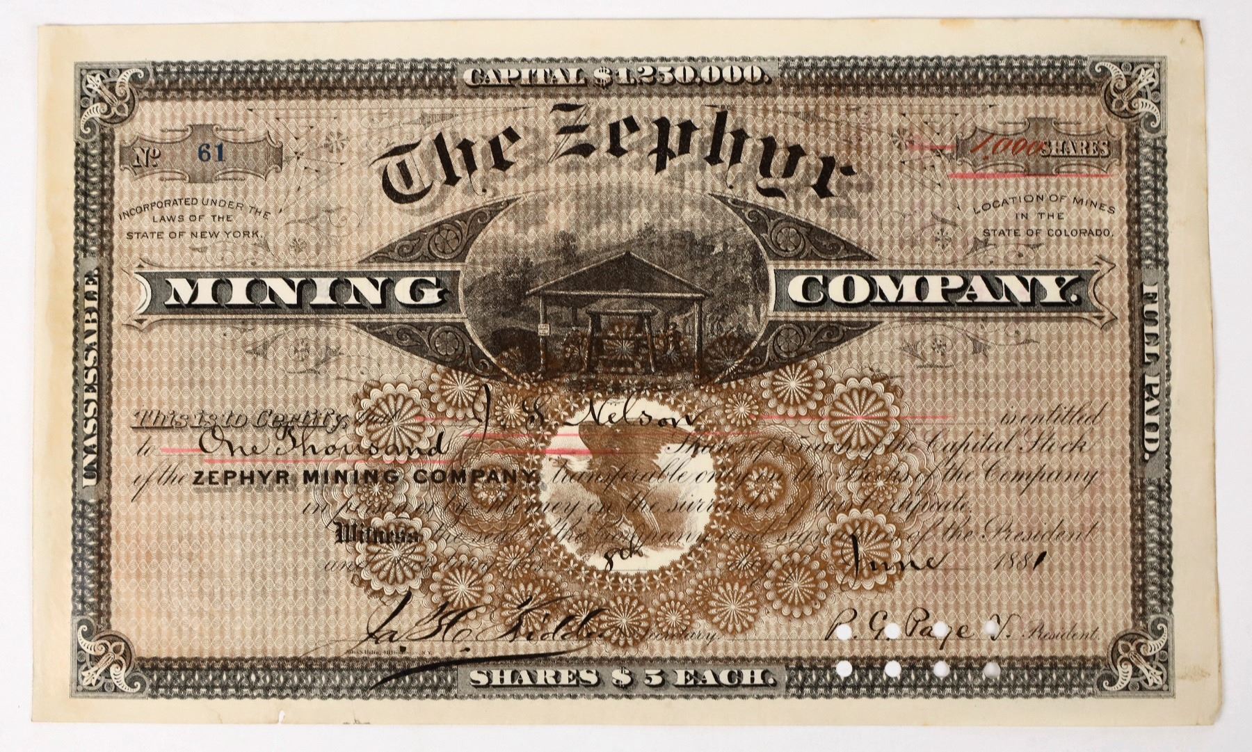 Inc. in New York. Mines in Monarch District, Leadville. No. 61, issued for 1,000 shares in 1881. Punch cancel through signature of vice-president. Vignette of surface hoisting works. Gilt facsimile RN with eagle. Black border with rust color design underprint. Printer: John S. Hulin, N.Y. Measures approx. 7" x 11." Some staining on left border from being in a stock book. Company mines included the Zephyr, Bonnie Bell, and Ben Hill, all located in Taylor Gulch (6 miles NW of Marysville). Veins were 4-8 ft. in width and contained auriferous galena and pyrite [ref: Burchard]